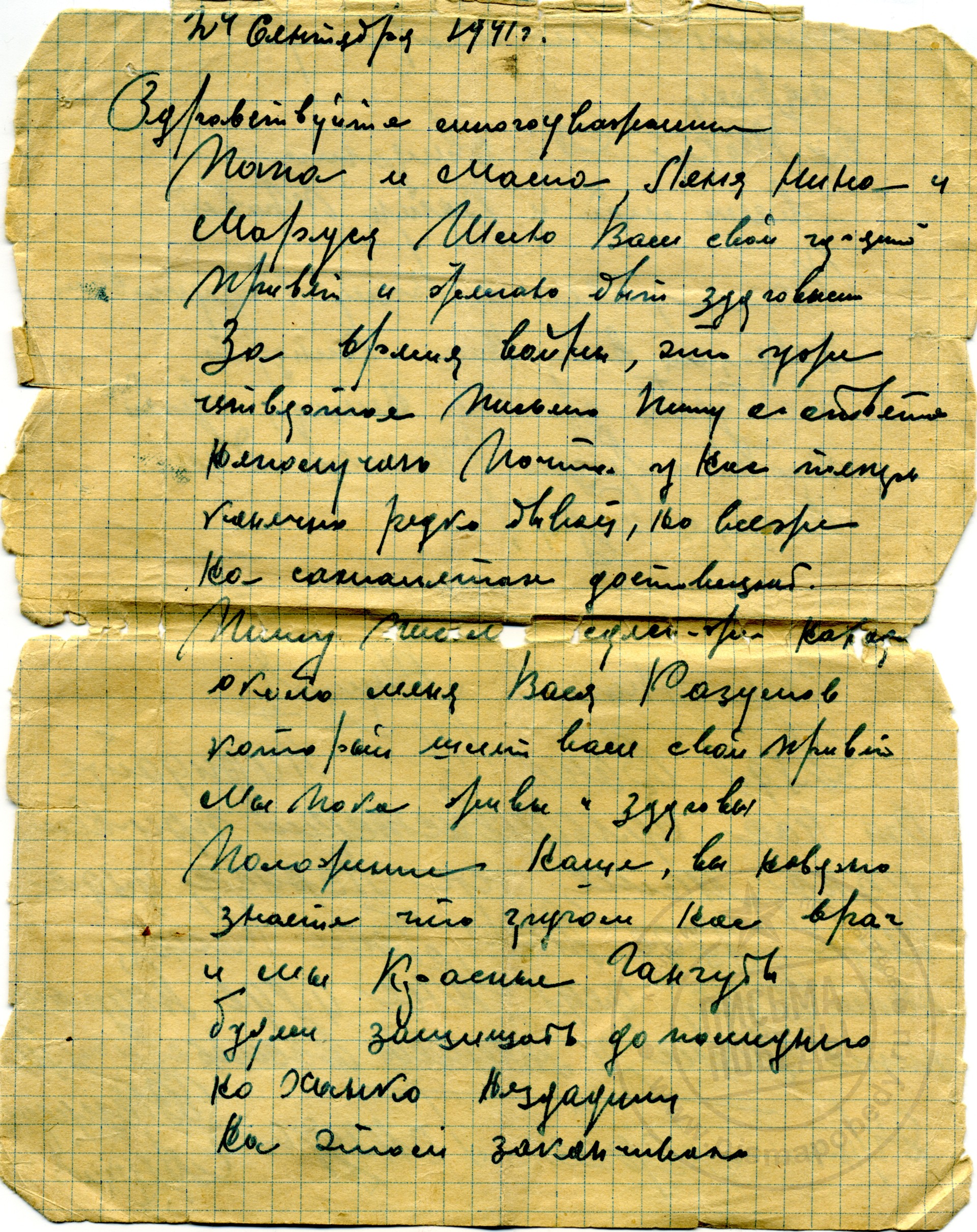 Текст написан не на случайном клочке бумаги, а на специальной заготовке для писем. Именно здесь иллюстрация в виде самолета, но встречаются картинки с красноармейцами, танками, советскими городами — даже в нашей подборке вы увидите немало подобных шаблонов. «Пропечатывали» на листах и открытках также лозунги, проклятия фашизму, а еще то, что сейчас назвали бы мотивирующими цитатами.