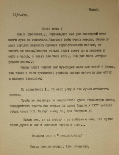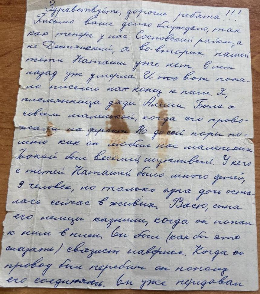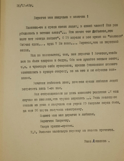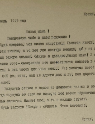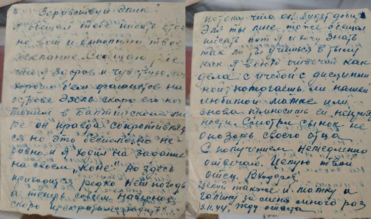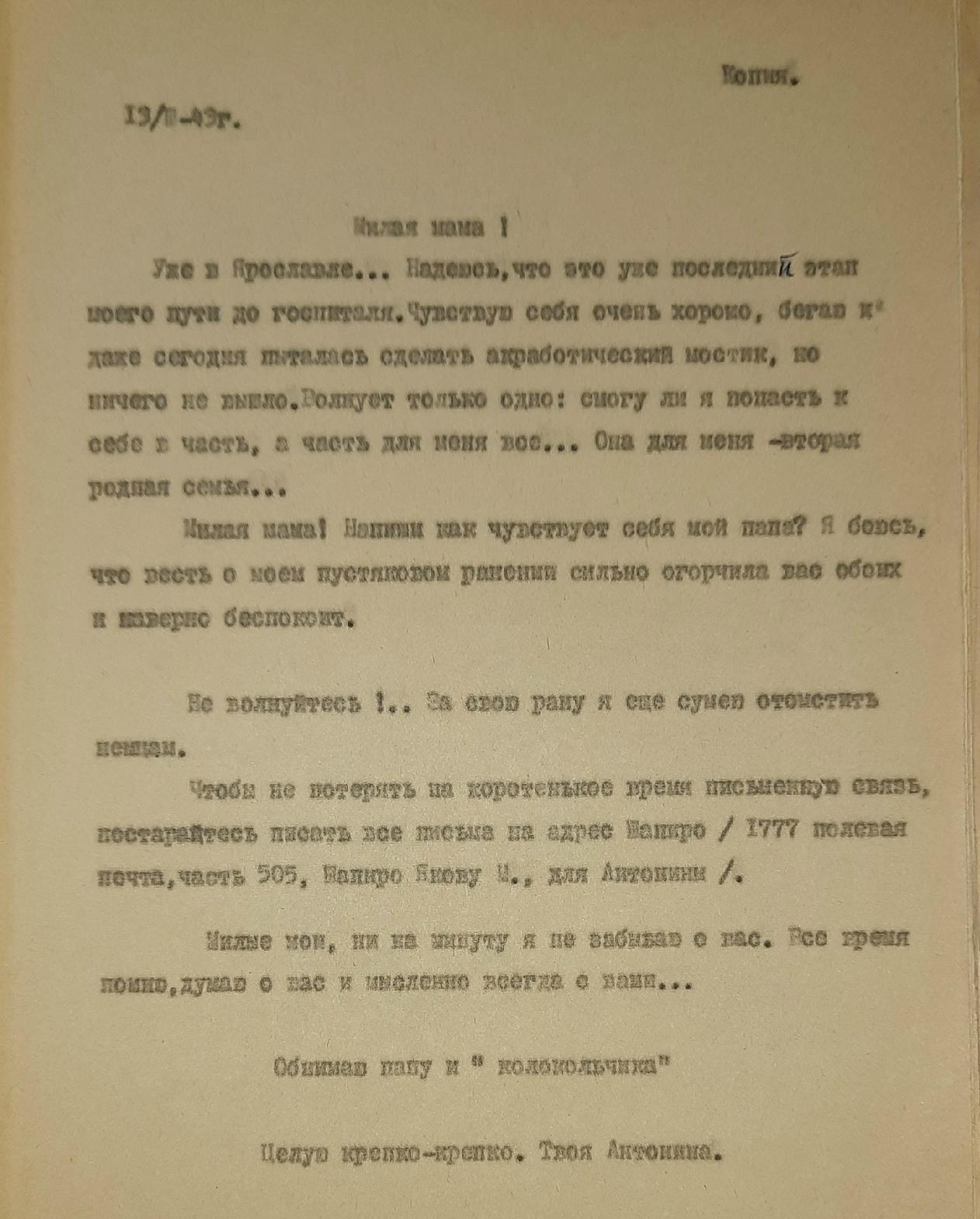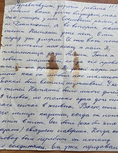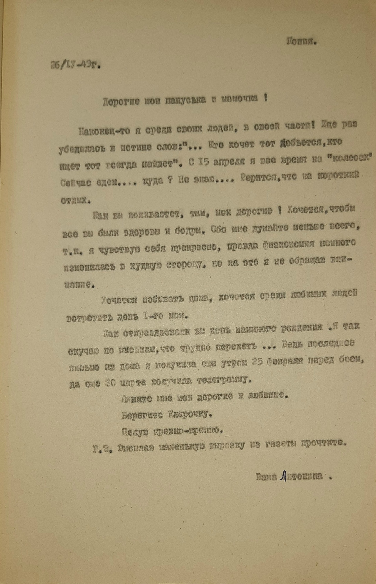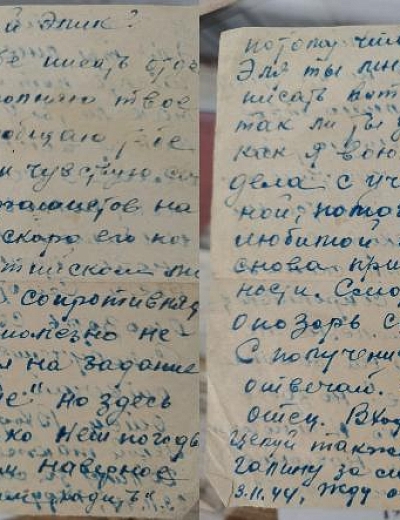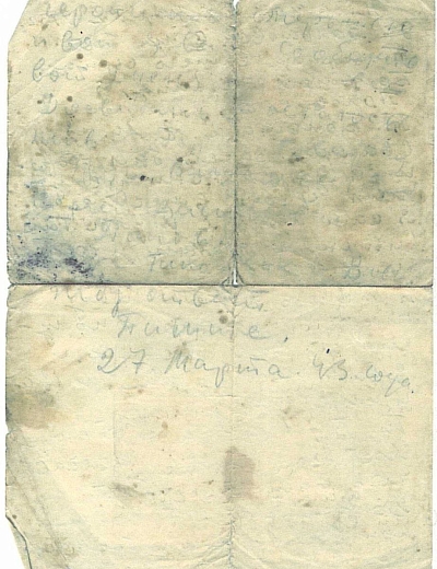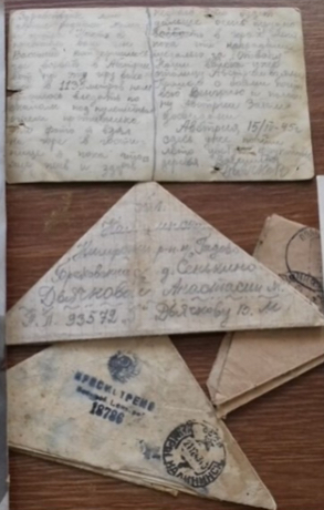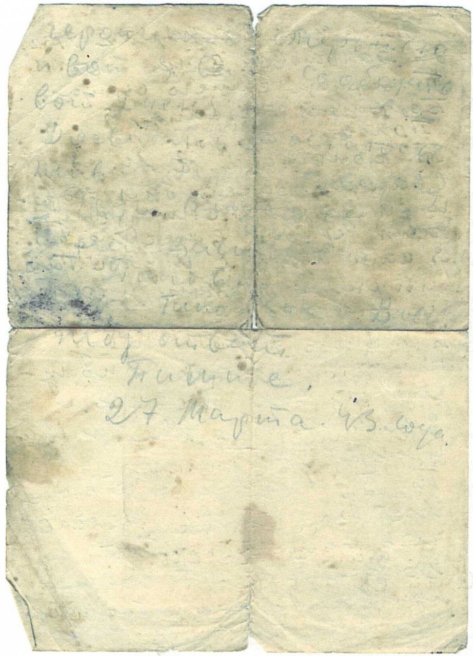 Василию было 15 лет когда началась война. Помогая фронту он пошёл работать на машиностроительный завод в город Кимры. У него была бронь, но он, приписав себе год, записался в 1943 году добровольцем в армию со словами, что скоро война закончится а я не успею повоевать с фашистами. С войны он так и не вернулся. Бабушка сохранила письма с фронта, пожелтевшие от времени треугольники, их невозможно читать без слёз. Совсем ещё юный мужчина обращается к маме и сестре с такой любовью: "С красноармейским приветом! Добрый день или же вечер. Здравствуйте мои дорогие родители. Мама и сестра Настя". И с такой ещё мальчишеской отвагой и желанием воевать и прогнать фашистов с родной земли, строки из его письма: " у нас день похож на одно и то-же и ничего не бывает...здесь всё разрушил и всё сжёг проклятый немец". Из писем мы узнали, что Василий был стрелком-десантником, как он пишет "будем опять прыгать с зонтиками". Из письма из Белоруссии от 05.09.1944года: "Письмо получил 4-ого сентября, а вы писали 11-ого августа. Эта фотокарточка будет мне памятью о доме. Настя мама сильно изменилась, т.е. постарела... домой вертаться ещё рано, когда разобьём проклятого немца, тогда снова заживём мирной жизнью". Последнюю открытку с видом Австрийского горнолыжного курорта Вася отправил 15.04.1945 года " Вот пришлось где воевать в Австрии, вот на эту гору высотой в 1135 метров нам пришлось влезать по склонам под пулемётным огнём противника". А 22.04.1945 года Василий был убит.