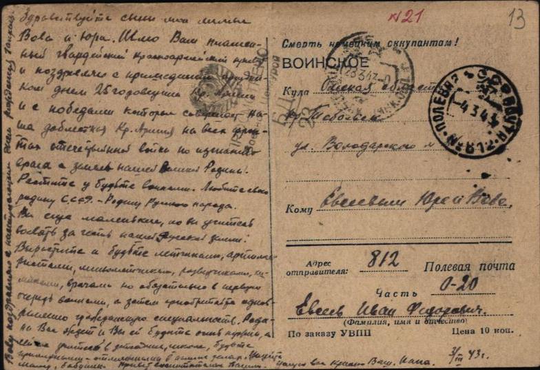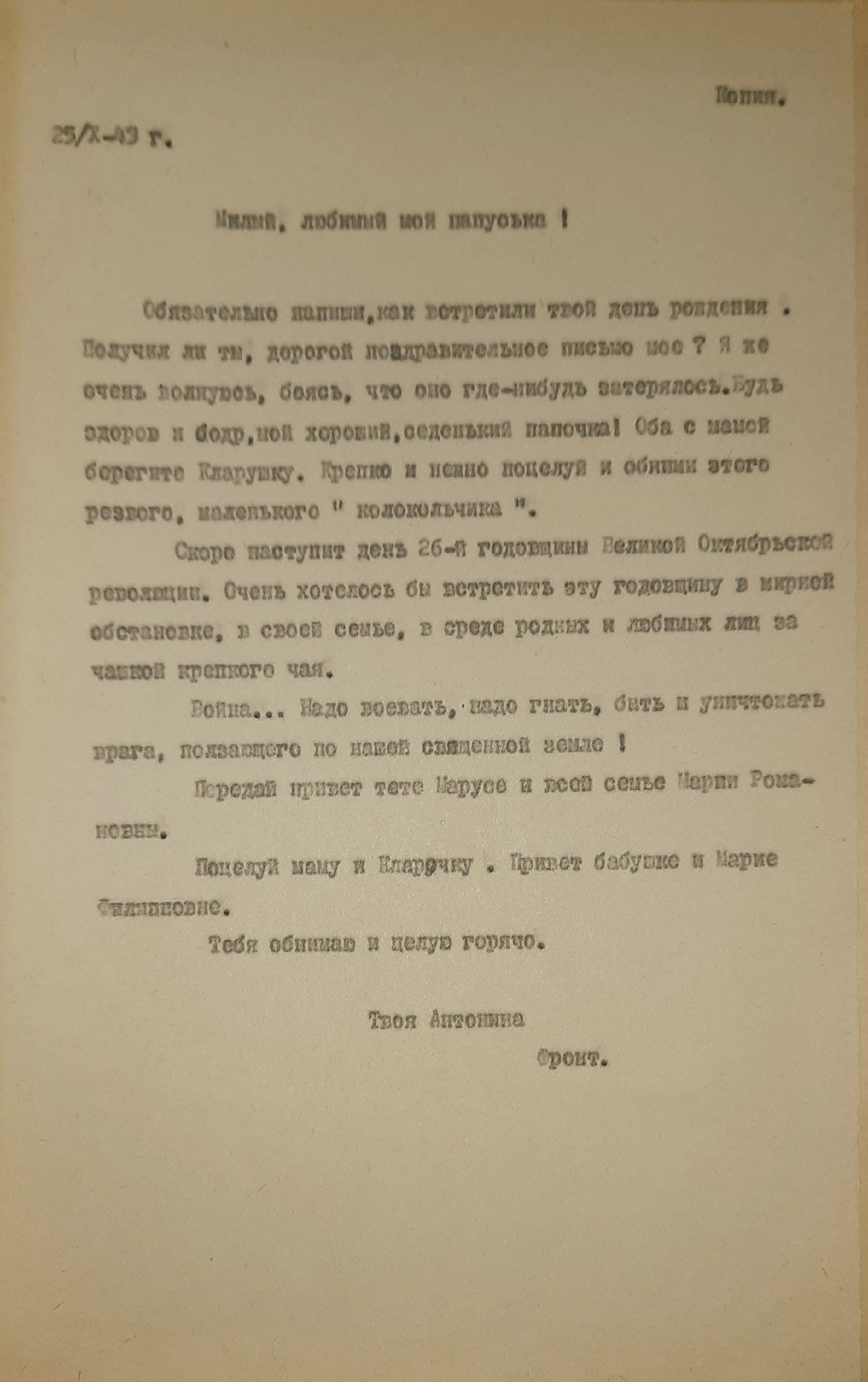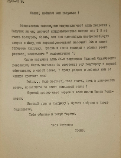 Сафонов Борис Феоктистович - гордость не только Плавской земли и Тульского края, но и всей России. Отважный лётчик-североморец, Дважды Герой Советского Союза, отдавший свою жизнь за нашу Родину, тоже писал письма домой, своим родным и близким: матери, отчиму, брату Евгению Ступину, жене и сыну Игорю. Сохранилось всего два коротких письма.