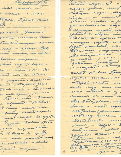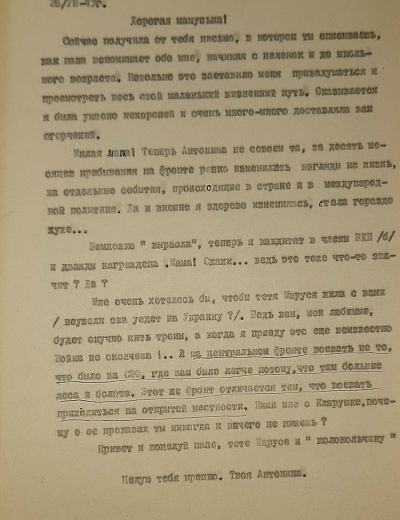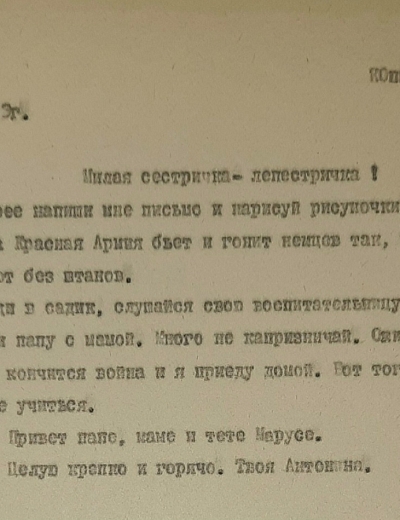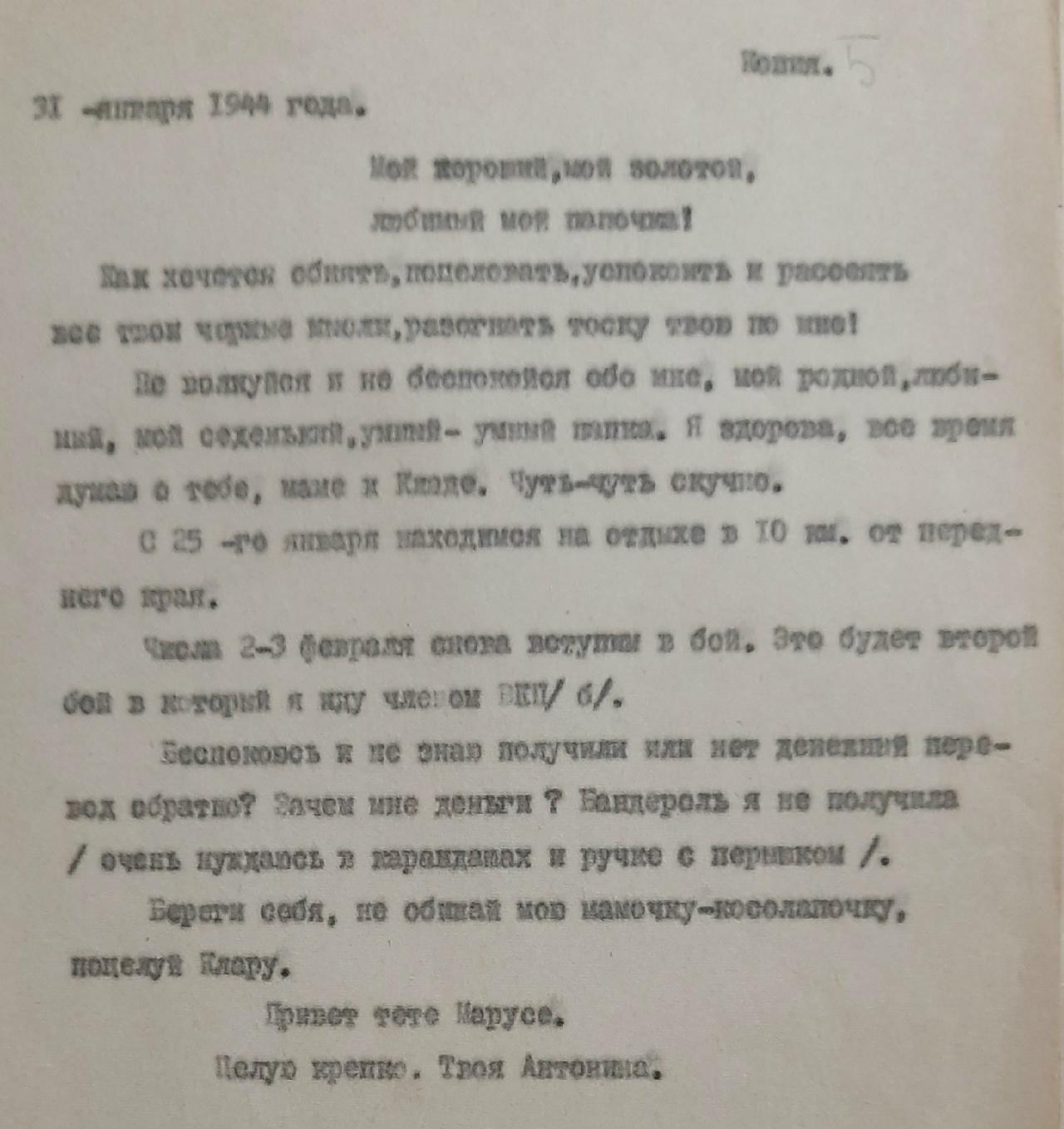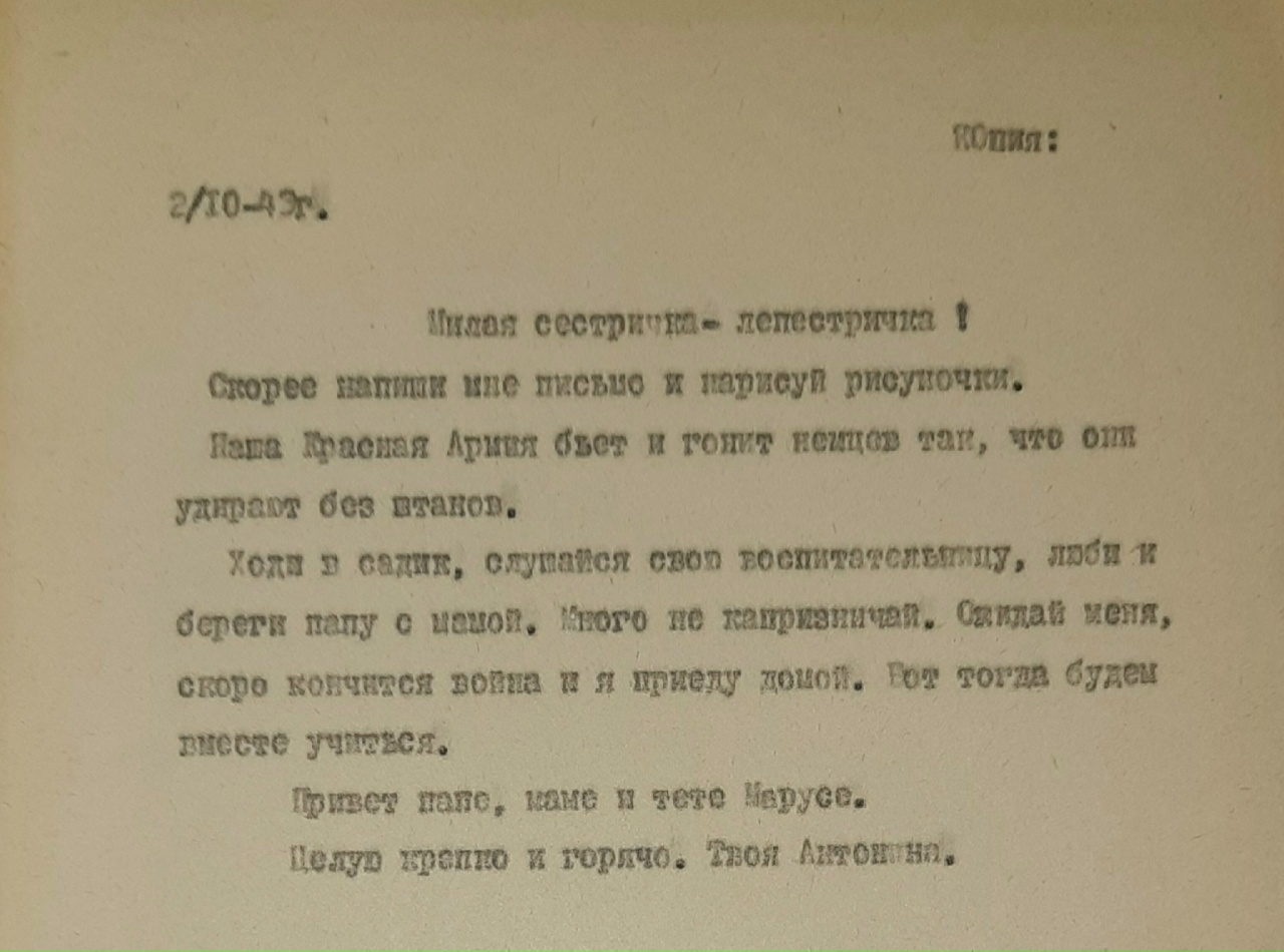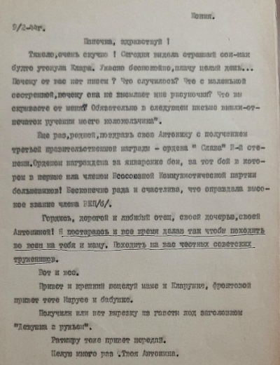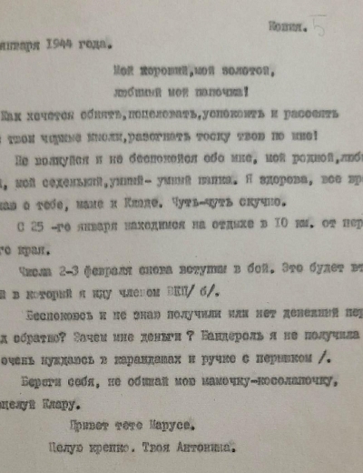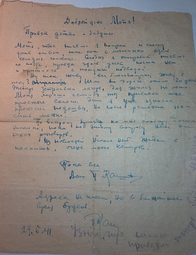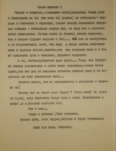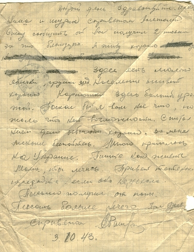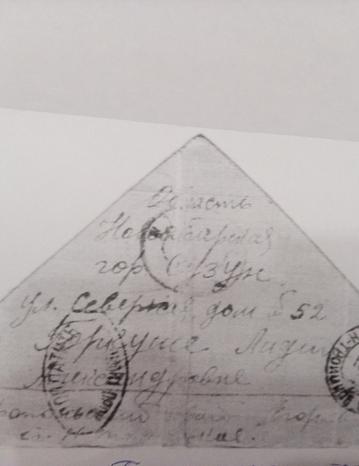 Письмо было написано 24 июня 1942 года Рыбальской Прасковье Михайловне в Свердловскую обл., Зайковский р-он, ст. Худяково, с. Скородум. В архиве хранится много писем этого автора. Читая их строки, понимаешь, какие теплые и нежные отношения были между супругами.