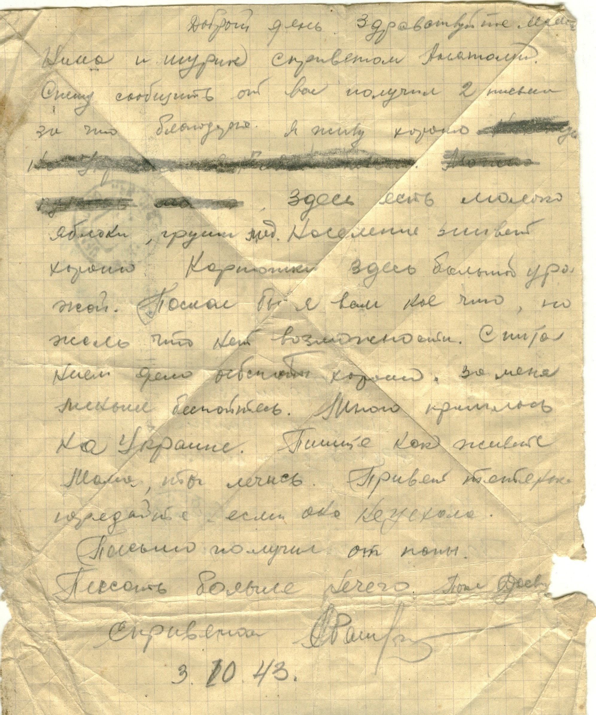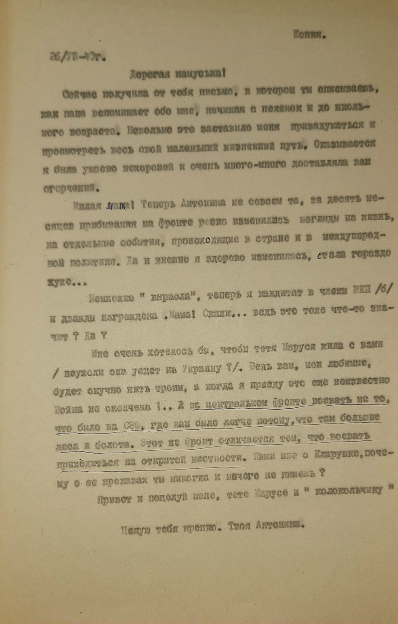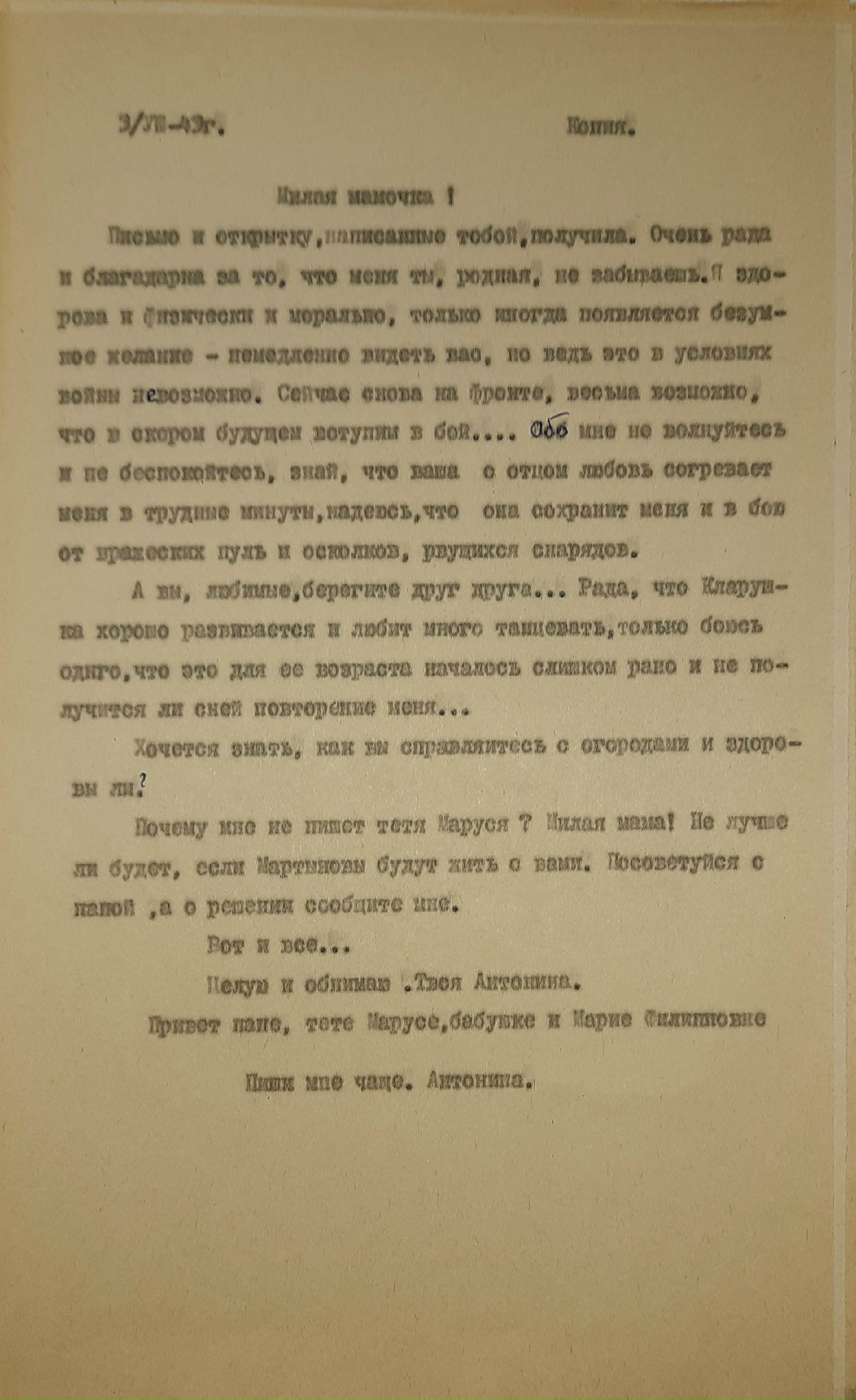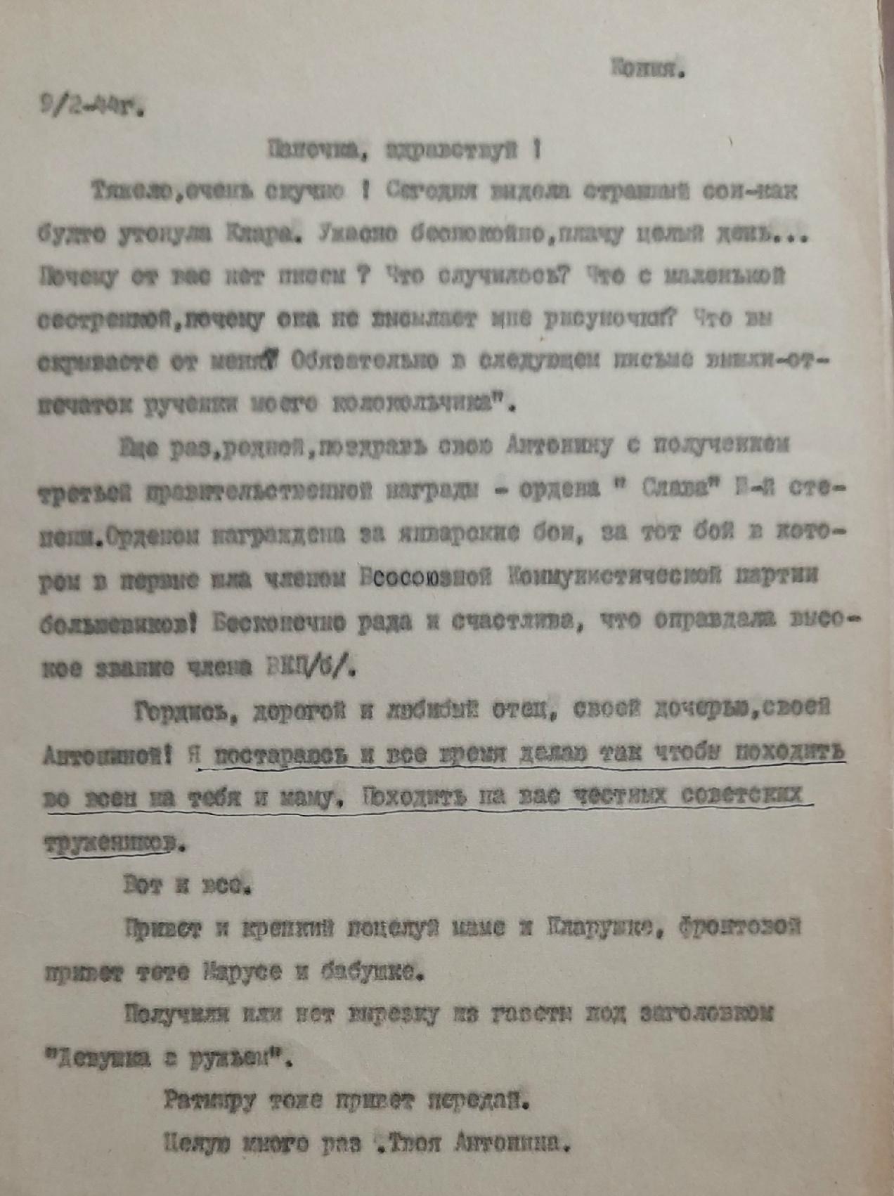 Письмо было написано 24 июня 1942 года Рыбальской Прасковье Михайловне в Свердловскую обл., Зайковский р-он, ст. Худяково, с. Скородум. В архиве хранится много писем этого автора. Читая их строки, понимаешь, какие теплые и нежные отношения были между супругами.