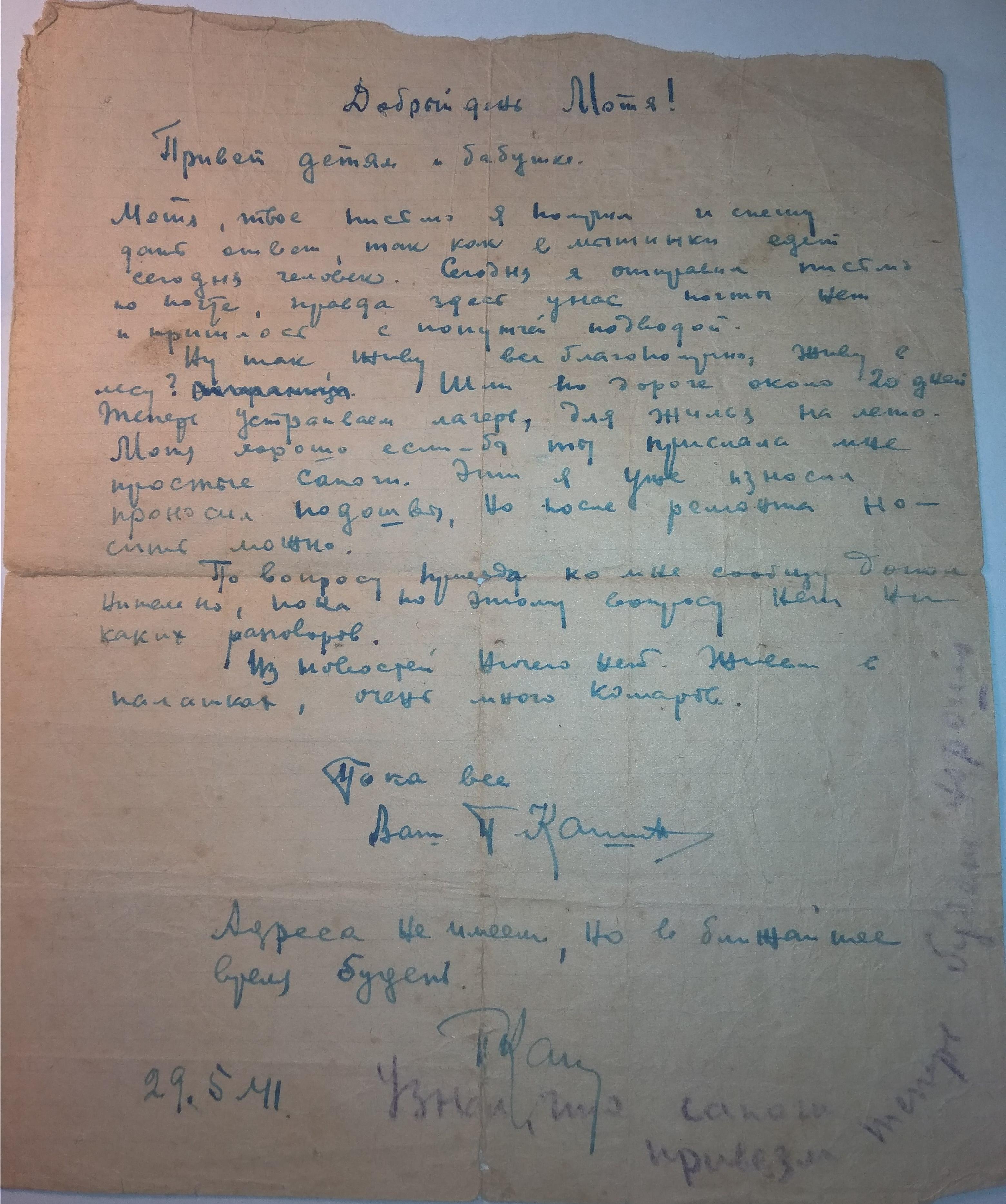 Письмо написано супруге - Карповой Екатерине Ефимовне.