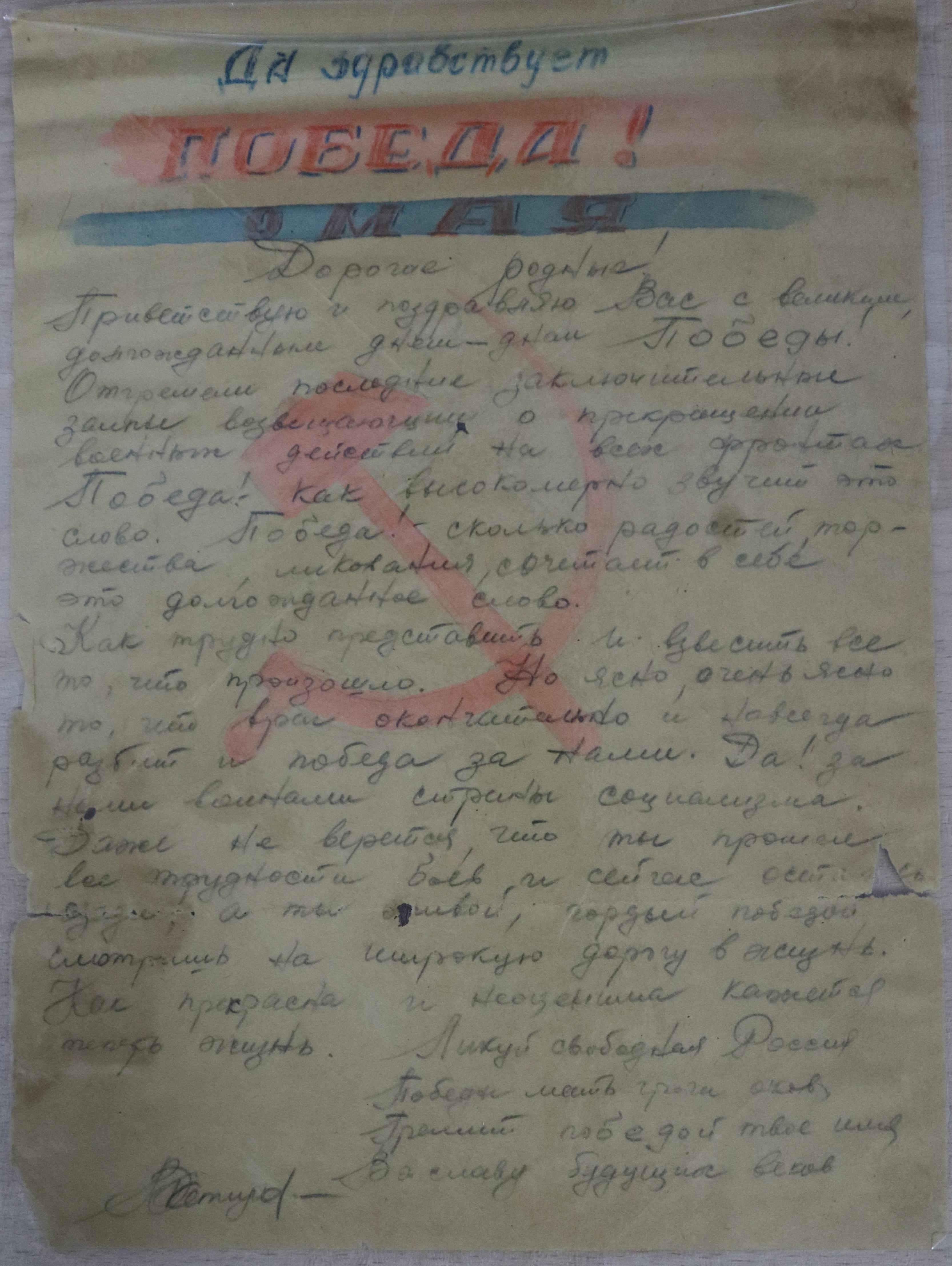 Тарасов Анисим Иванович — житель села Ома Ненецкого автономного округа, участник Великой Отечественной войны. Последнее письмо Тарасова было написано 31 января 1944 года и адресовано его супруге Анастасии Максимовне. В письме Тарасов сообщал, что едет на фронт, но, по его мнению, больше не увидит жену и детей из-за жестоких боёв. Тарасов погиб через 17 дней после написания письма.