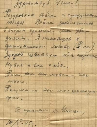 Шондин Сергей Александрович родился в 1914 году 2 апреля в городе Юрюзань, Челябинской области. С ранних лет мой прадедушка был творческим человеком: умел играть на баяне. До войны он работал организатором оркестра и киномехаником в клубе. В 1941 году Сергей Александрович был призван на фронт. Ему было 27 лет.Дедушка служил радиотелефонным мастером 265 Гвардейского минометного Черновицкого полка, в звании гвардии старшина. В течение всего периода боевых действий полка, в разных условиях боевой обстановки мой прадедушка проводил зарядку аккумуляторов и, неустанно работая, полностью обеспечивал радиосвязь полка.Мой прадедушка прошел всю войну радиотелефонным мастером и праздник Великой Победы встретил в Берлине.Вернувшись с войны в 1945 году, Сергей Александрович продолжил работу в Юрюзанском клубе имени Кирова киномехаником и являлся руководителем военно-духового оркестра.Пройдя всю войну и подорвав свое здоровье, прадедушка умер в 1958 году в 44 года.