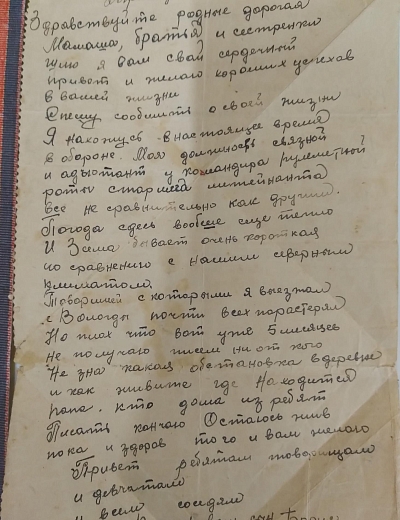 Романов Борис Александрович родился вд. Анциферовская Троицкого с/совета Усть-Кубинского района Вологодской области. Погиб в Венгрии под Будапештом, д. Ракошсентмихаль 28 декабря 1944 года. Письмо было написано за восемь дней до гибели автора. (Данные «Книги Памяти Усть-Кубинского района Вологодской области», 168 стр.)