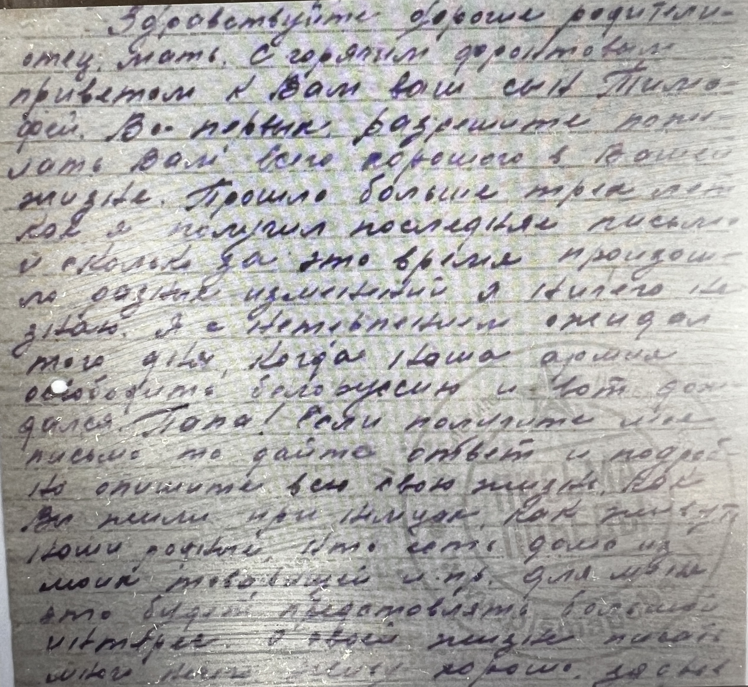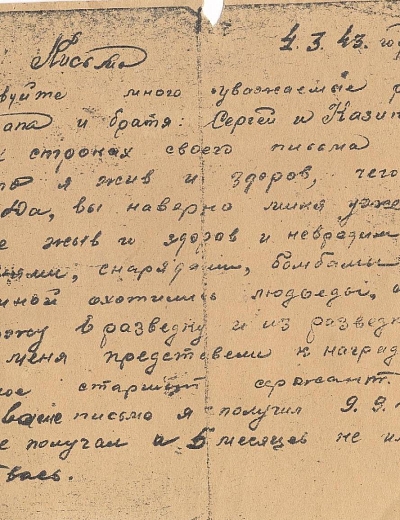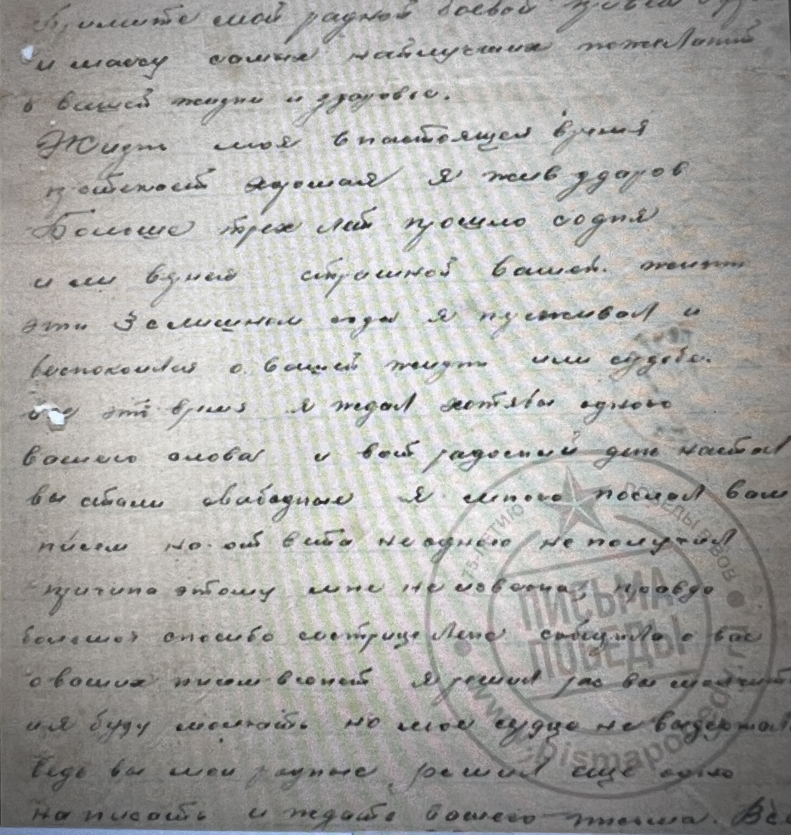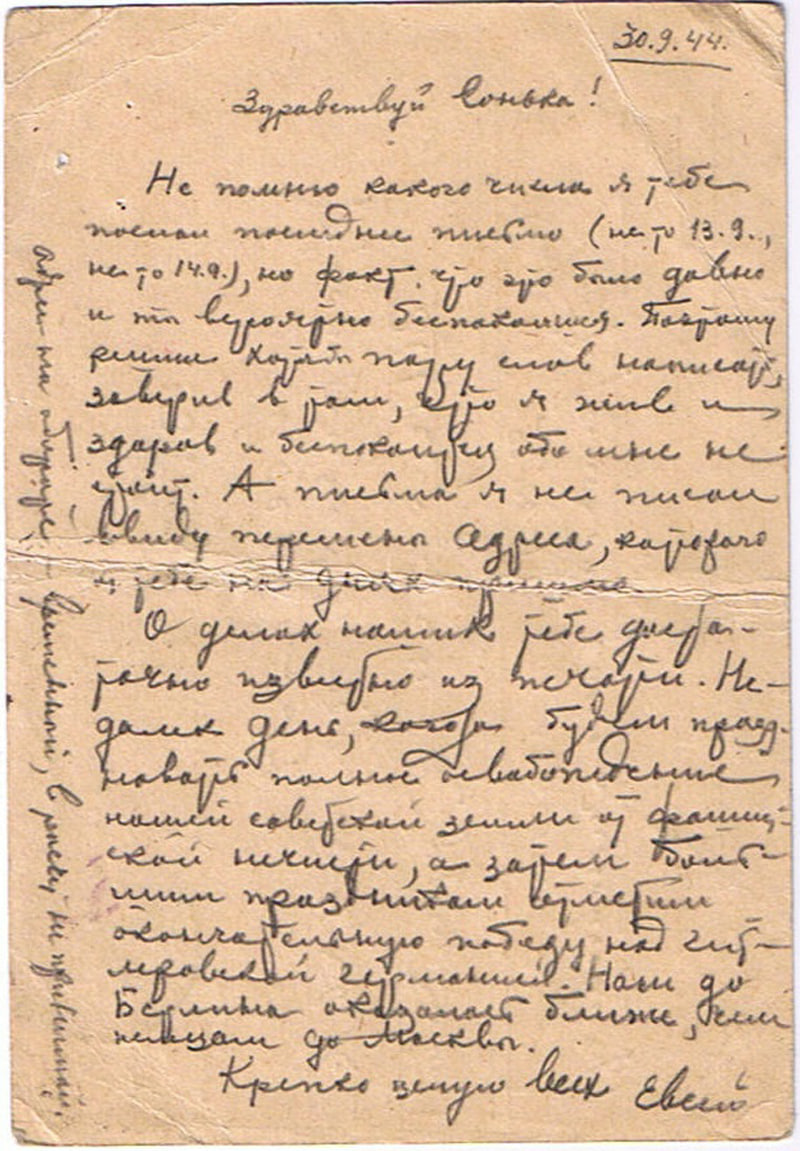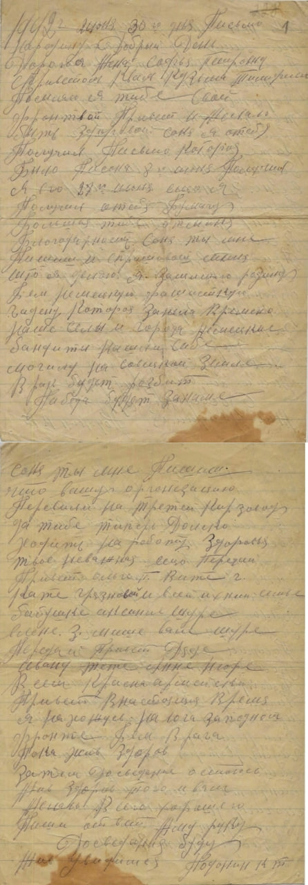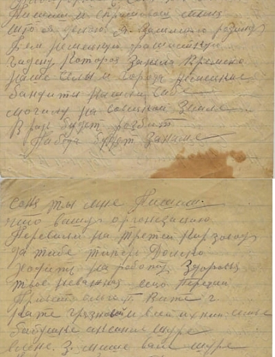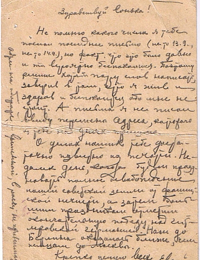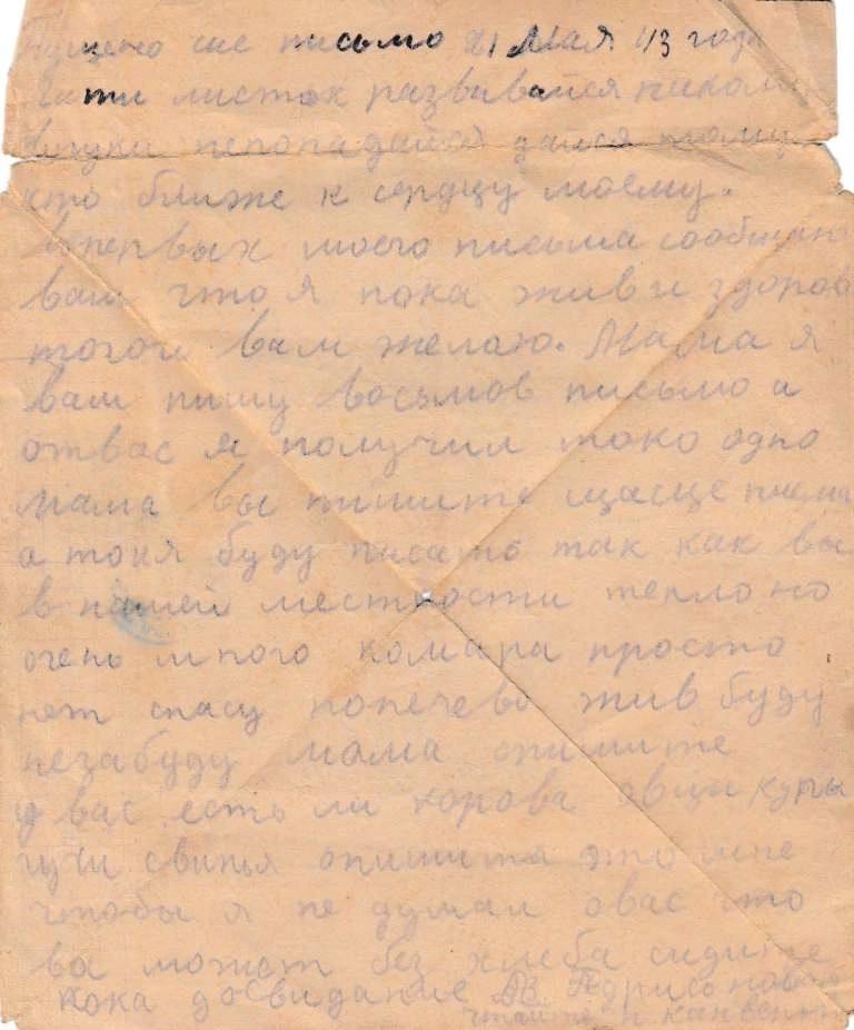 Письмо Адели Михайловны Гарпф из Ленинграда сыну Михаилу Иосифовичу Гарпф. 15 октября 1941 г. / Гарпф Адель Михайловна (1887—1970-е). - 1941. - Из спроводительного документа: брат Михаил (1916 г.р.) в начале войны был на гастролях с оркестром Утесова в Москве и избежал блокадных мук. Вот ему-то и адресованы письма, мама писала ему почти ежедневно (июль 1941—июнь 1942). Сохранилось примерно 150 писем. Ветхий документ. Разрывы. Сгибы. Замятия. Пожелтения бумаги.
