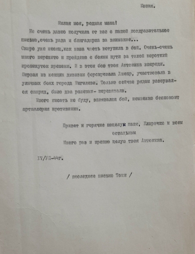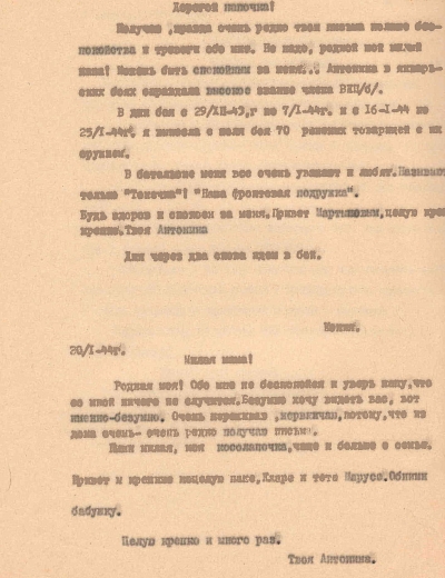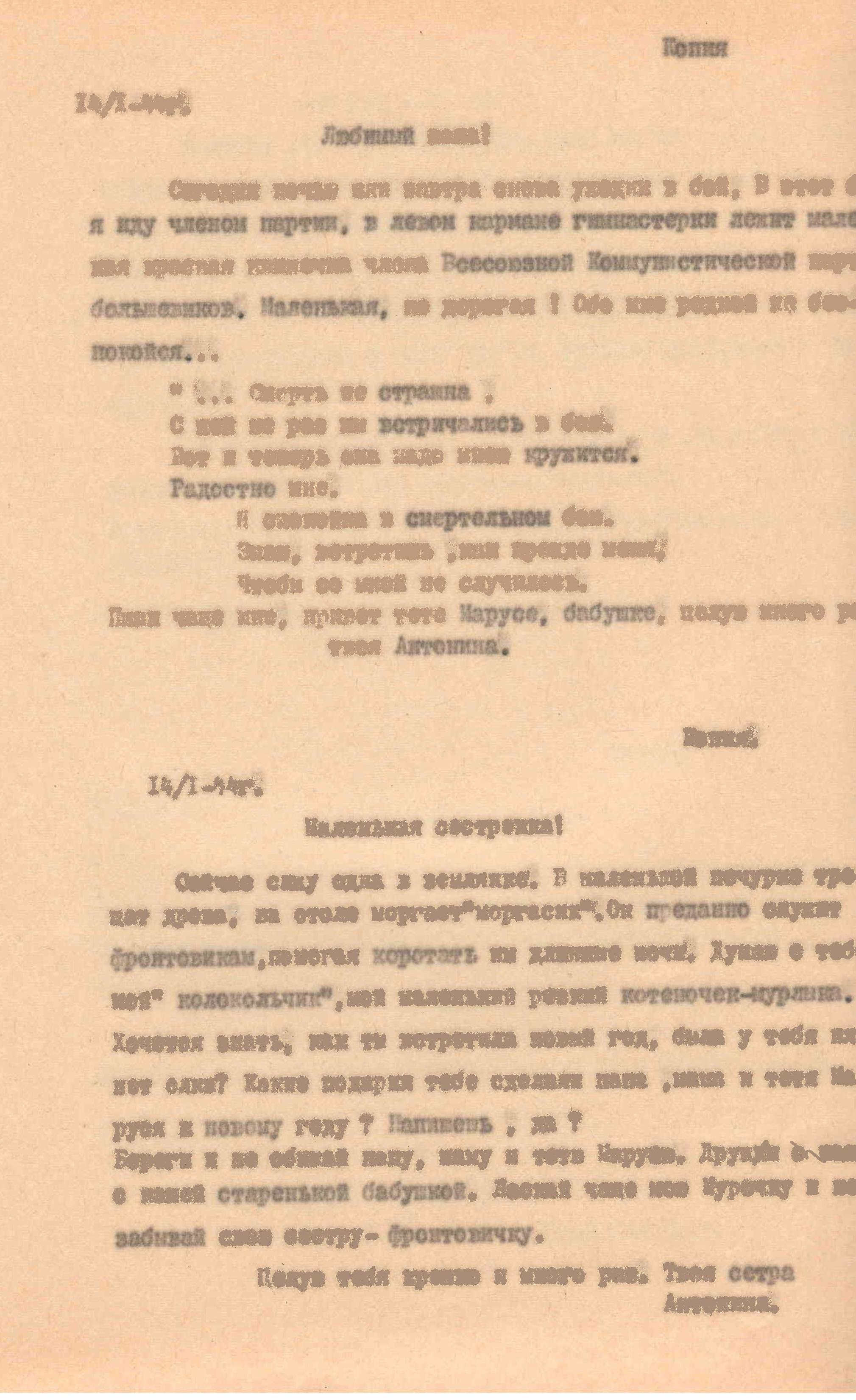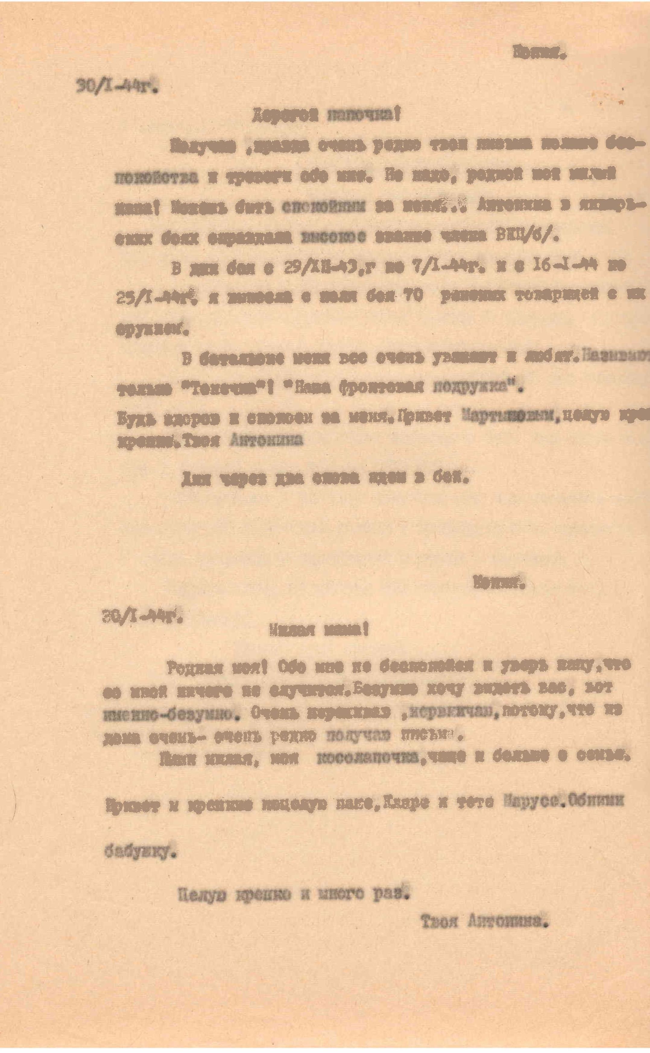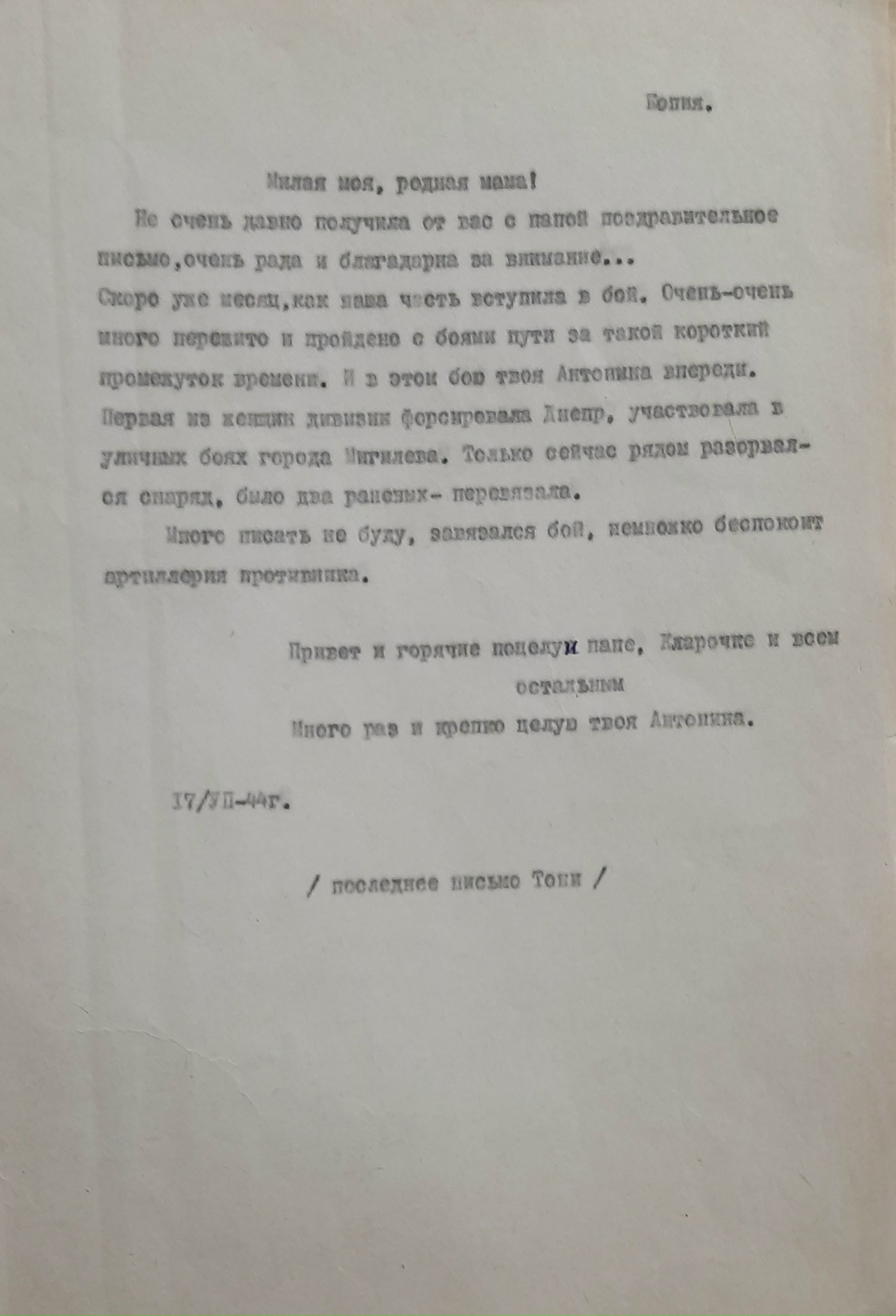 Меньшенина Антонина Филипповна (1922-1944). Ученица школы №3, г. ВоткинскаРодилась 6 июля 1922 года в семье военного комиссара на станции Тайга Томской железной дороги. До 1934 года жила на Урале. В 1934 году семья переезжает в город Воткинск, где Тоня заканчивает в 1937 году неполную среднюю школу, а в 1940 году - среднюю школу № 1 имени Пушкина. В августе этого же года держит экзамен в Московское высшее театральное училище имени Щепкина, но не проходит по конкурсу. Осенью 1941 года поступает в Свердловское театральное училище, закачивает 1-й курс. 28 октября 1942 года подаёт заявление в Троицкий РВК о зачислении её добровольцем в ряды Красной Армии. В ноябре 1942 года прибыла на фронт и была зачислена в санитарную роту. В январе 1943 года становится санитарным инструктором, позднее окончила краткосрочные курсы снайперов.
