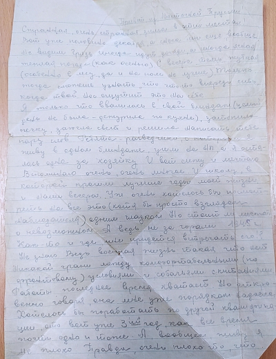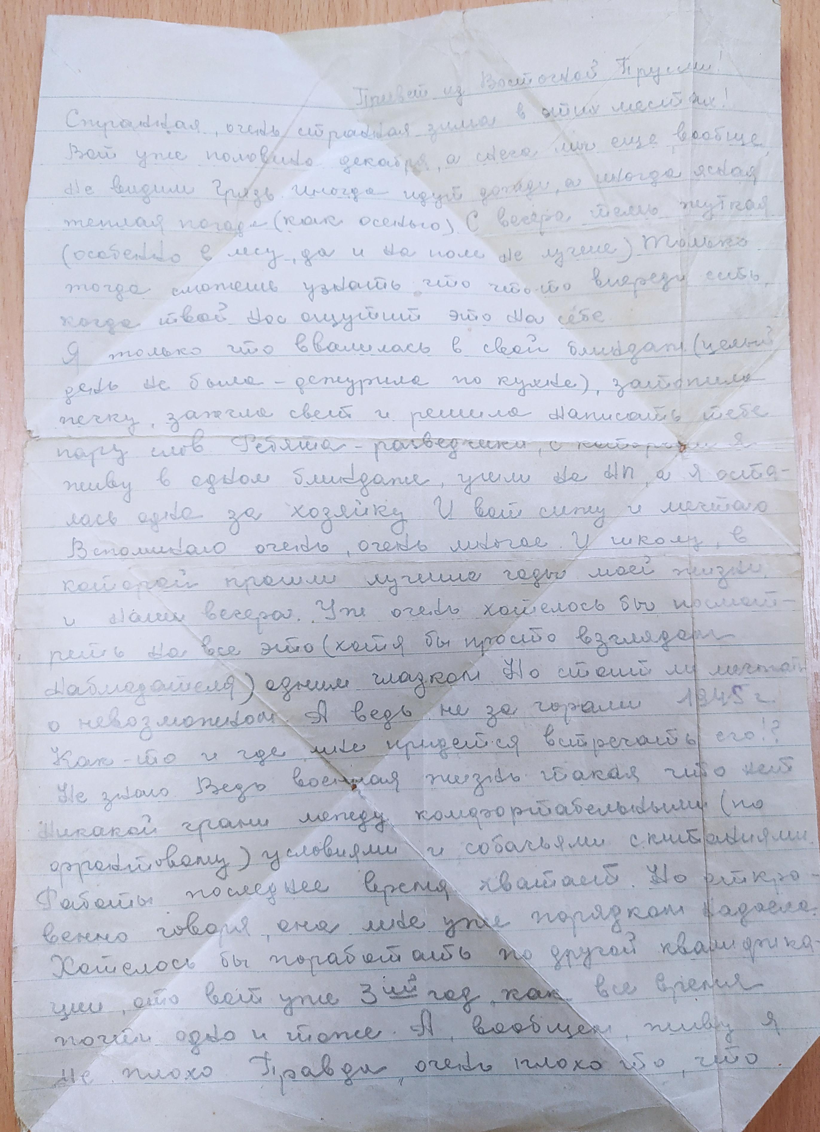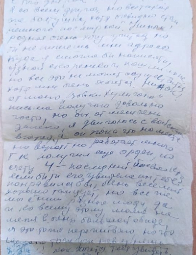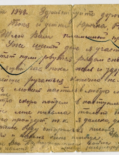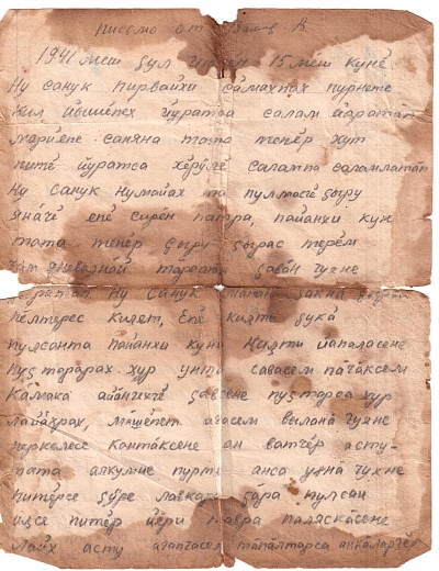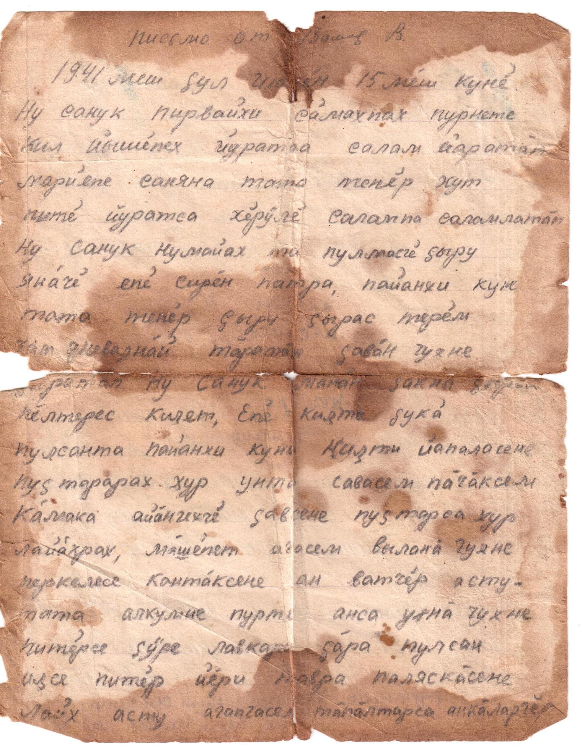 Васильев Василий Васильевич, родился в январе 1912 года в селе Турмыши Янтиковской волости Цивильского уезда Казанской губернии (ныне Янтиковского муниципального округа Чувашской Республики). В 1929 году семья Васильевых переселилась в деревню Выселок Хучель Янтиковского района Чувашской АССР (ныне деревня Хучель Канашского муниципального округа Чувашской Республики). В колхозе прапрадед работал трактористом. Женился на односельчанке Осиповой Александре Осиповне. Но началась война. На второй день пришла повестка в военкомат. Прапрадед ушел на фронт. Дома он оставил свою жену Александру, дочь Марию и сына Александра. Красноармеец Васильев В.В. два месяца проходил военные учения в Челябинске на танкиста, а потом его отправили на фронт. 27 августа 1941 года поступил на службу в 688 стрелковый полк 103 стрелковой дивизии. Пропал без вести 6 сентября 1941 года под Смоленском. Летом 1941 года успел написать домой три письма из Челябинска. Все письма были написаны на чувашском языке.