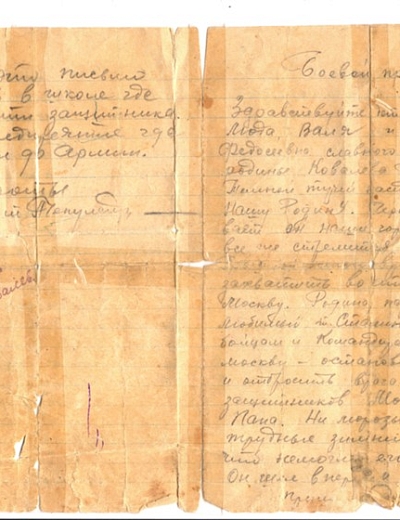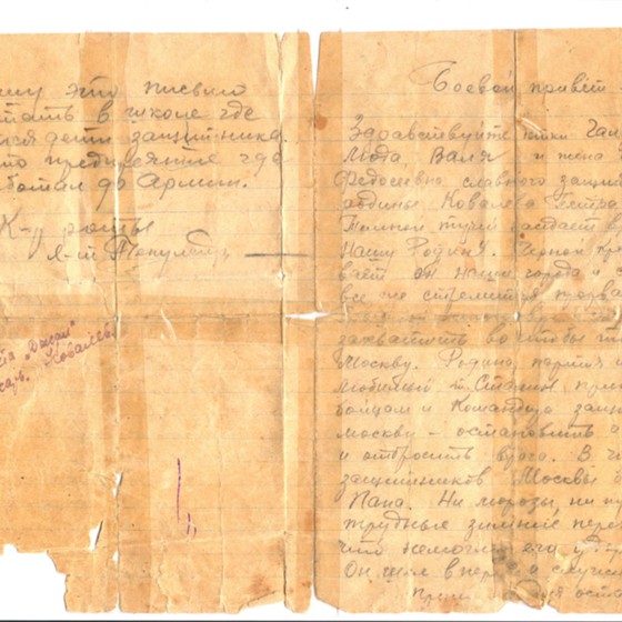 Ковалёв Пётр Иванович, сражаясь в боях под Москвой, проявил героическую храбрость. Когда он был ранен и находился в госпитале в ноябре 1942 г., рядом с ним был его командир - лейтенант Чекулаев, который написал письмо семье Петра Ивановича. В письме Чекулаев передал со слов прадеда всю его любовь к жене и детворе, описал все его заслуги в нелегком бою. Это письмо пронизано общенародной верой в победу и невероятным духом патриотизма, любовью к своим соотечественникам и Родине.