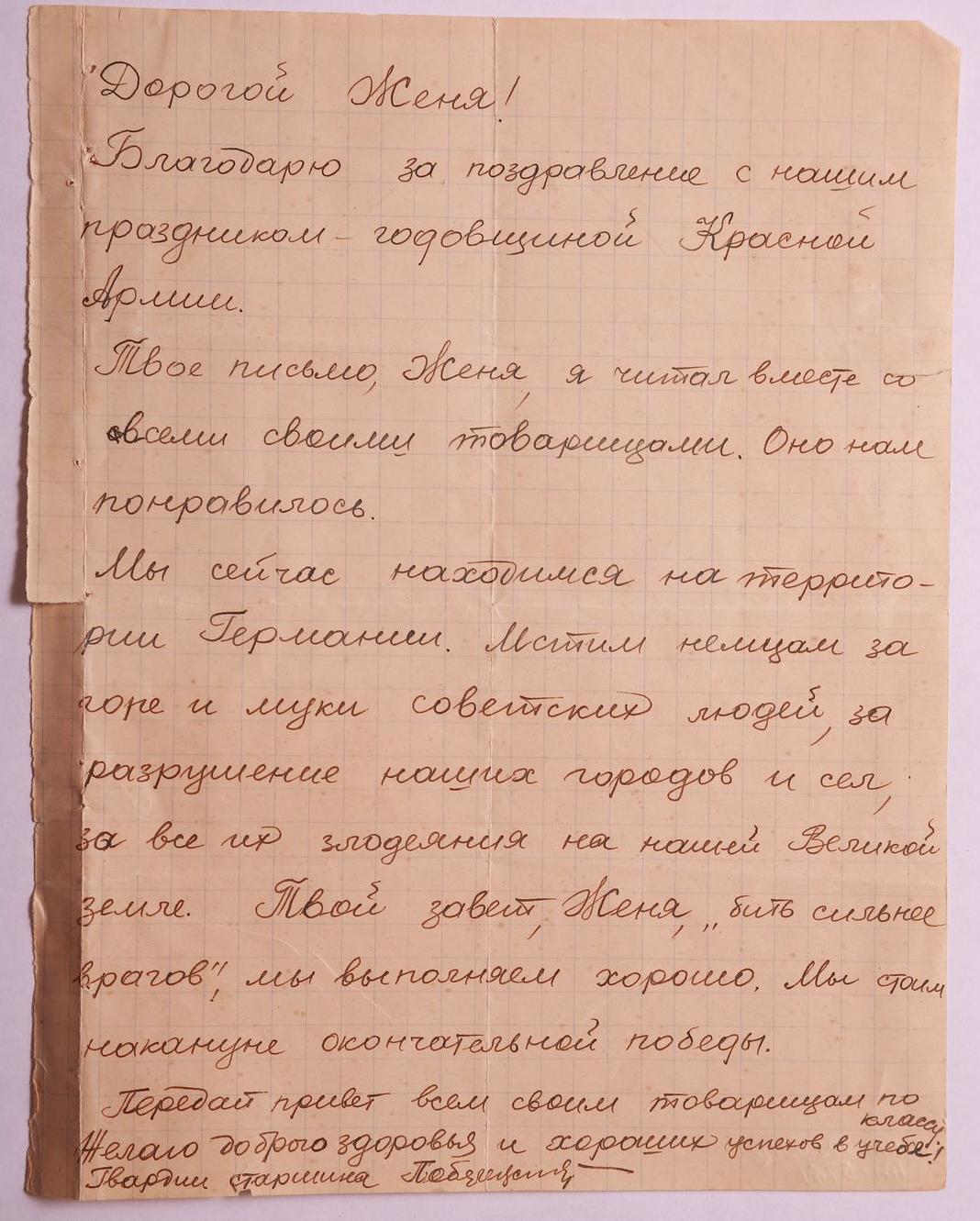Письмо фронтовое гв.старшины И.Е. Побережника из действующей армии ученику 1 "Б" класса средней железнодорожной школы N 62 г.Новороссийска Слученко Жене.