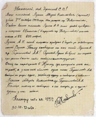 Сержант Лунин Август Николаевич погиб в боях за полное освобождение Новороссийска от немецко-фашистских захватчиков. Письмо фронтовое командира части 41417 родным сержанта Лунина Августа Николаевича, артиллериста 83-й отдельной стрелковой Новороссийско-Дунайской дважды Краснознаменной ордена Суворова бригады морской пехоты ЧФ, с сообщением о его гибели.
