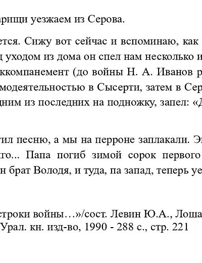 Иванова – Колодкина Вера Николаевна с первых дней войны активно включилась культобслуживание госпиталей и воинских частей и лично участвовала в 1377 концертах в качестве солистки и аккомпаниатора-аккордеониста, участница художественной самодеятельности Дворца культуры металлургов г. Серов, в 1944 году входила во 2 концертную фронтовую бригаду Свердловского областного дома народного творчества. Иванова-Колодкина В.Н. имеет ряд благодарностей командования, награждена грамотами и медалью «За Победу над Германией». После войны проживала в г. Свердловск. Родилась 5 ноября 1923 года в Сысерти Свердловской области в семье служащего. Восьми лет Вера пошла в сысертскую школу, через два года с семьёй переехала в Серов, где отец Веры, выпускник Свердловского музыкального училища - устроился на работу киноиллюстратором. Многое в жизни семьи Ивановых было связано с серовским Домом пионеров, где также работал отец, руководитель художественной самодеятельности и активный участник разных творческих коллективов и кружков, которые посещали Вера с братом. Семья Ивановых была очень музыкальна- в доме часто звучала музыка, пели отец, брат. Словом, путь в музыку для Веры был предопределён. В 15 лет она одна переехала в Свердловск, для подготовки к будущей профессии. 2 года посещала подготовительные курсы(?) в Свердловском музыкальном училище, и в 1940 году поступила на 1 курс на отделение специализированного фортепиано, в класс А.К. Агте. В 1942 году Вере пришлось оставить учёбу из-за тяжёлого материального положения и уехать к матери в Серов. Там музыкальная профессия помогла устроиться музработником в детский сад при заводе и выжить в суровые военные годы. В 1944 году Вера Иванова решила пойти на фронт вслед за отцом и братом. Она активно включилась в культобслуживание госпиталей и воинских частей в качестве солистки и аккордеонистки. Победив в конкурсе за право выступления во фронтовых концертах, была зачислена во 2-ю концертную фронтовую бригаду Свердловского областного дома народного творчества. После войны Вера Николаевна продолжила учиться и завершила своё образование в 1947 году. В этом же году вышла замуж за военного, «служила» вместе с мужем, часто переезжая к местам его службы. В 60–х годах возвратилась на Урал. Работала концертмейстером в музпедучилище и параллельно училась в Свердловском пединституте на музыкально-педагогическом отделении по специальности «пение и музыка» (1965-69). В 1966 году стала преподавать в музыкальном училище им. П.И. Чайковского общее фортепиано. Покинула училище в 1978 году в связи с уходом на пенсию.