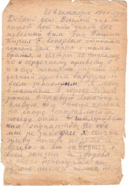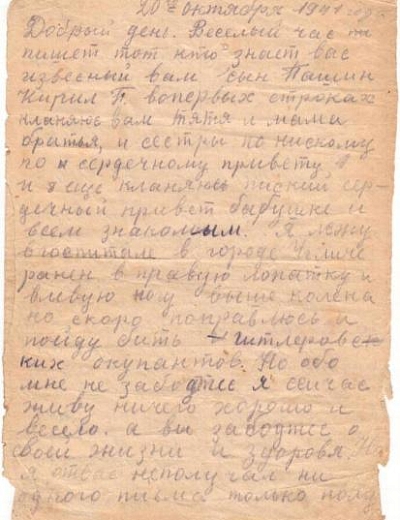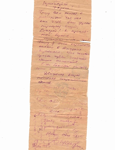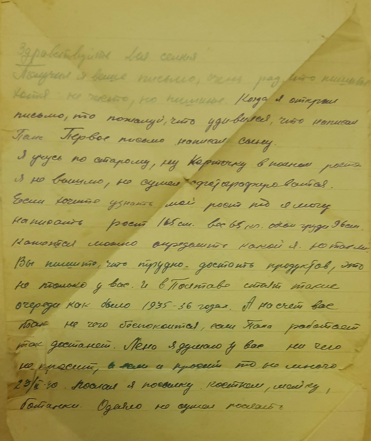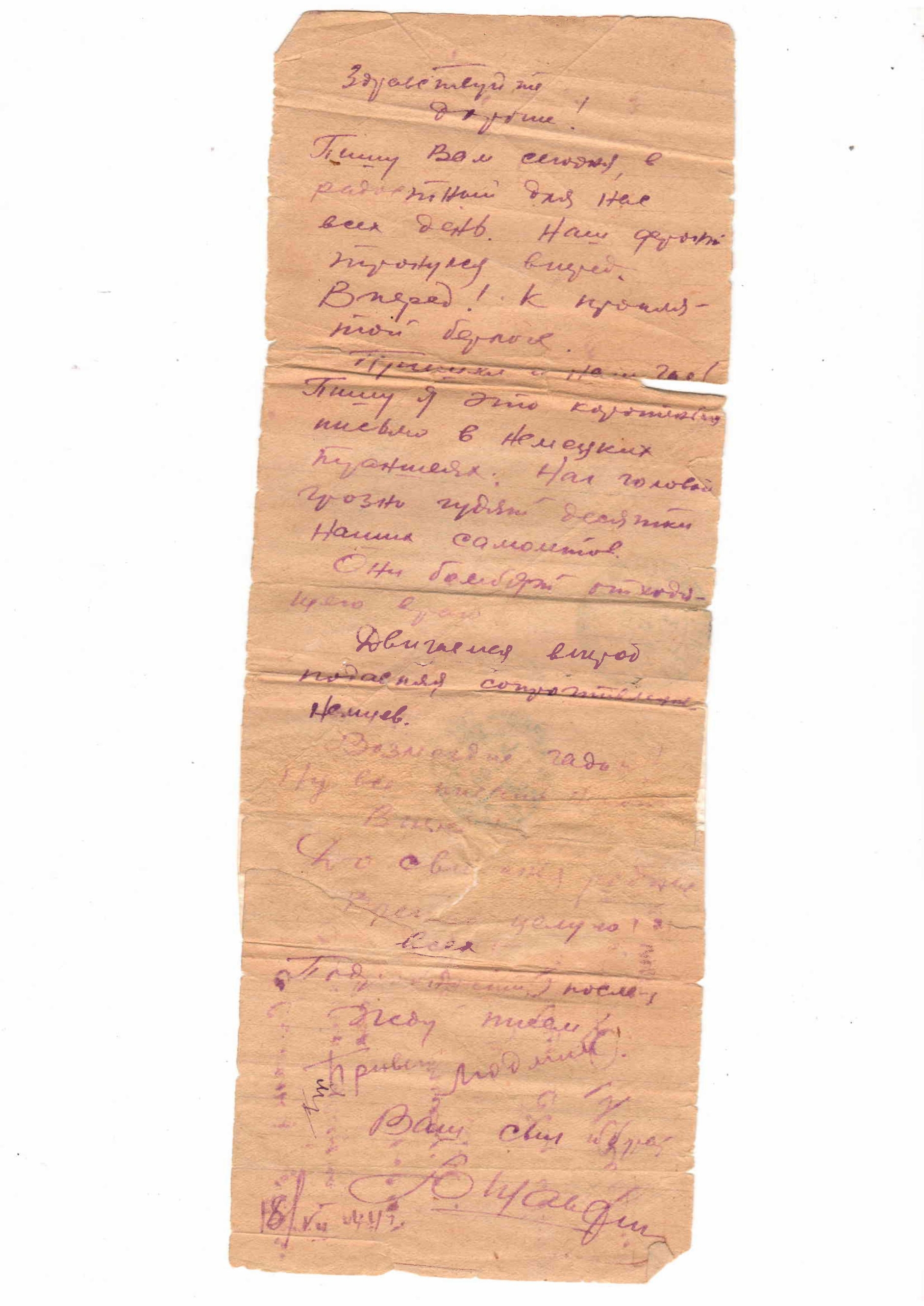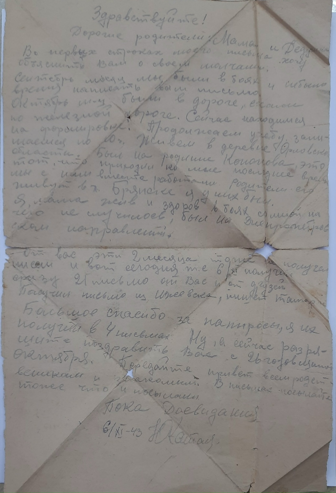 Одно из последних писем, это письмо от 3 января 1943 года. В нем Маслов Георгий отвечает на просьбу матери сделать фотократочку, что если сможет, то снимется и просит ее писать почаще. Он начал письмо, как обычно: «Добрый день. Здравствуйте дорогие родные Мама, Женя, Витя...» Но закончил он его не обычными словами «до свидания» а печальным словом «прощайте».