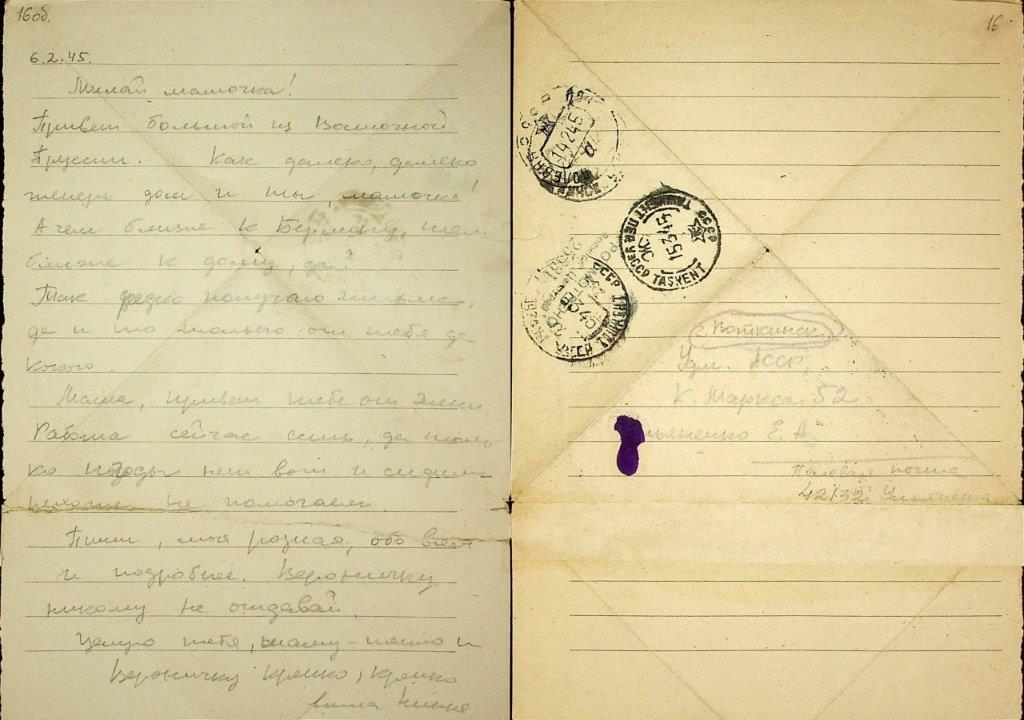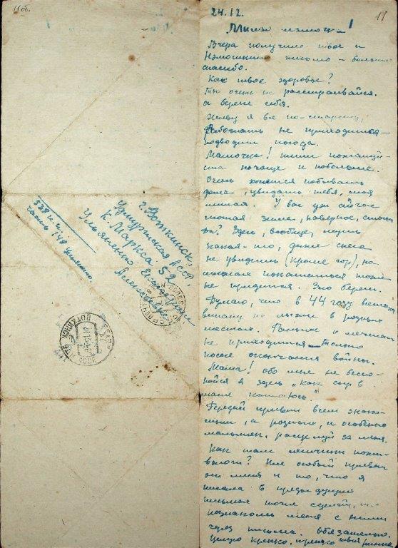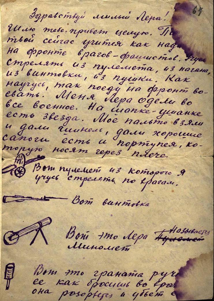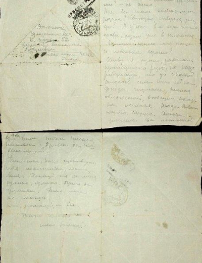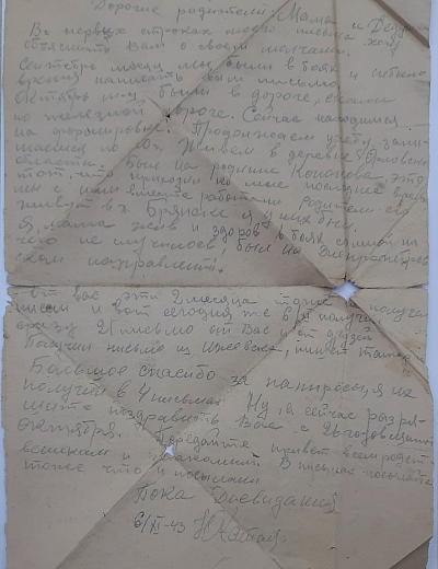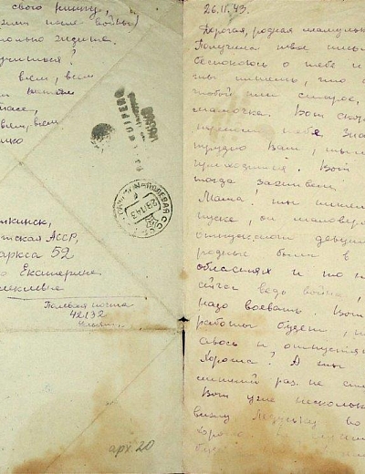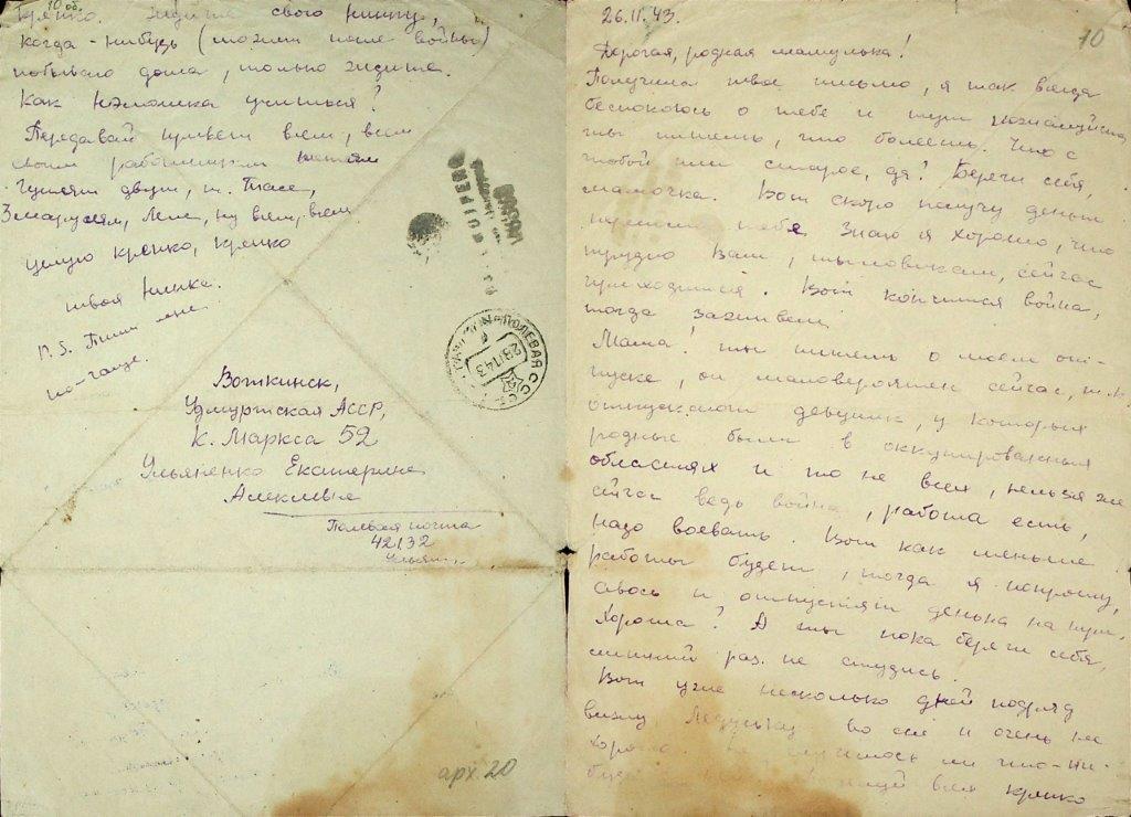 Георгия Степановича переправили в глубокий тыл «где не слышно ни бомбежки, ни оружейного гула» в Свердловскую область. Он пишет, что проезжали мимо города Молотова и стояли везде по долгу. Каждое письмо на фронте было как «небольшой праздник» , ведь переживали не только за тех, кто на фронте, но и за тех, кто остался дома. Так ефрейтор интересуется у мамы запаслись ли они дровами на зиму, и переживает, если долго нет ответа.