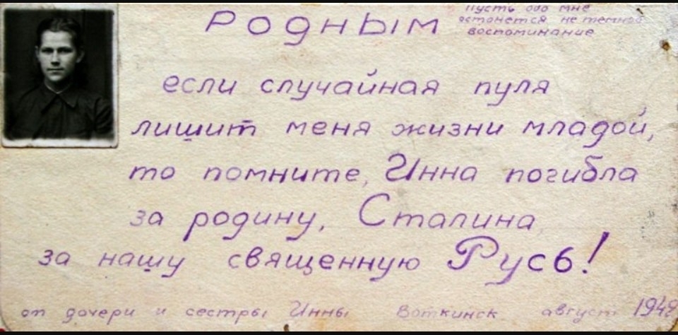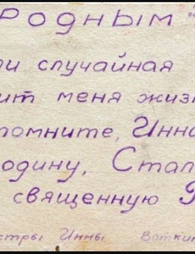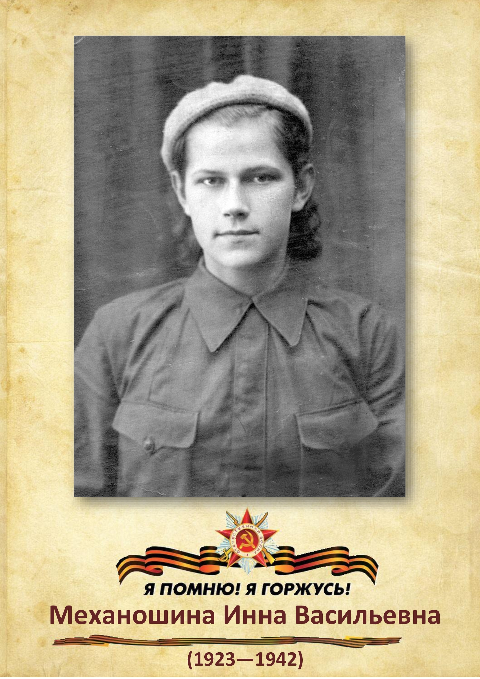 Последнее письмо домой Инна Механошина написала 4 декабря 1942 года. «Скоро пойдём в бой. Не сегодня завтра, с часу на час ждём приказ. Никогда в жизни дивизион свой я не оставлю. С ним я начала свой путь, с ним и кончу. Погибну только героем. Скоро в бой. Очень хочется жить, дышать, ходить по земле, видеть небо над головой, но не всякой жизнью я хочу жить, не на всякую жизнь я согласна».