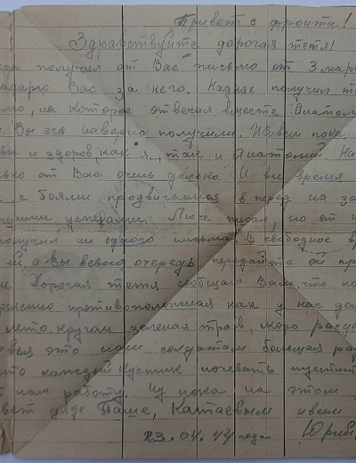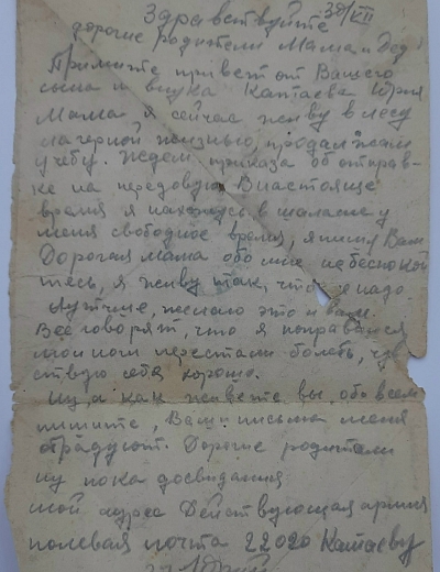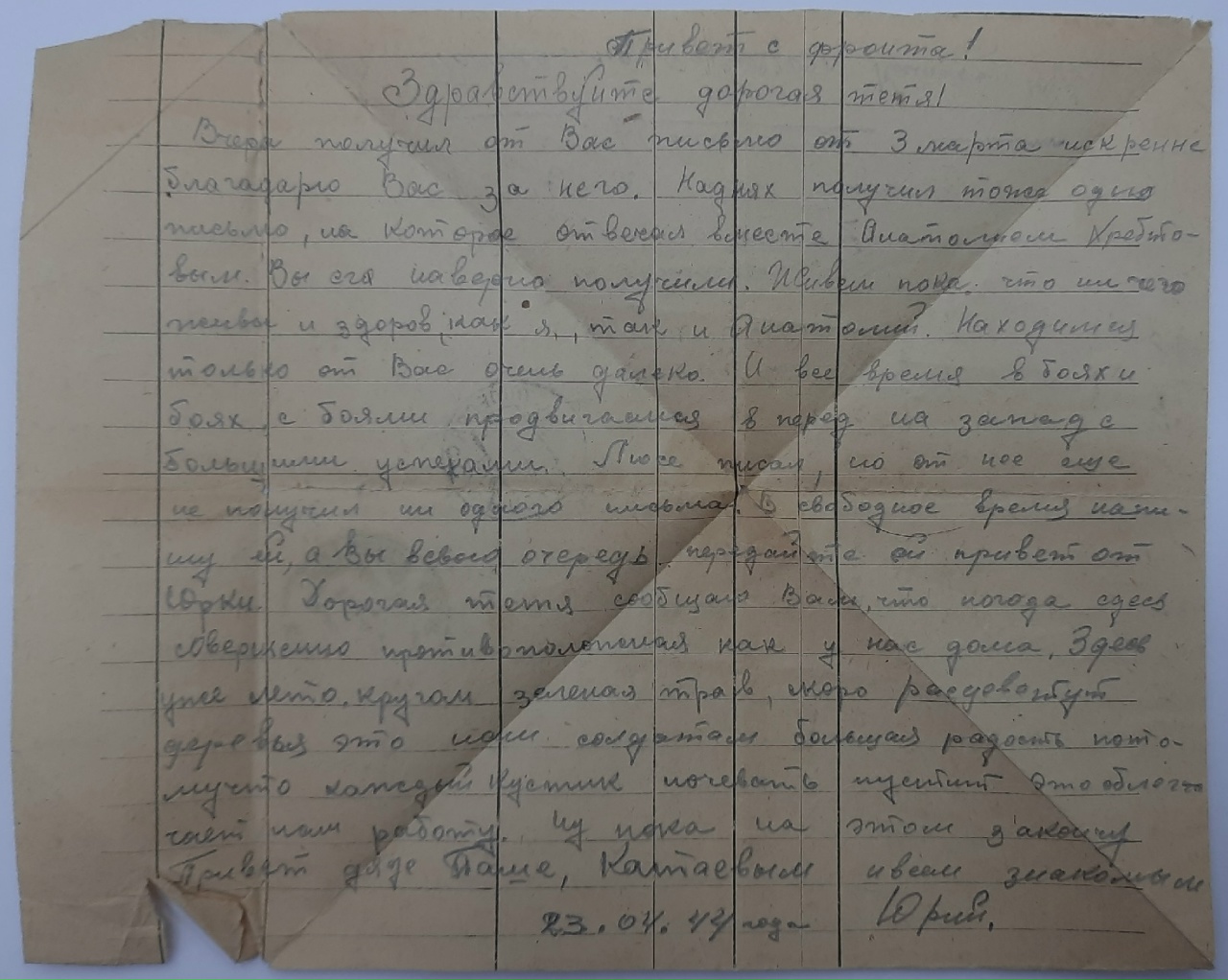 Юрий Катаев - выпускник средней школы № 3 им. А.С. Пушкина, г. Воткинска. Боец 174-го отдельного истребительно-противотанкового ордена Красной Звезды дивизиона имени Комсомола Удмуртии. В РККА с 9.05.1943 года, в ВОВ с 20.07.1943 года, наводчик 45-мм ПТО 174 ОИПД 172 СД, ефрейтор. Принимал участие в Белгородско - Харьковской операции, Донбасской операции, 18.09.1943 года освобождал г. Павлоград. Участвовал в заключительной части Черниговско - Припятской операции, 22.09.1943 года форсировал р. Днепр. В ноябре - феврале 1943 - 1944 годов принимал участие в освобождени Правобережной Украины и Белоруссии. Участвовал в Гомельско - Речицкой операции, Калинковичско - Мозырской операции, 3.02.1944 года приказом № 018/н по 388 СП 172 СД награждён медалью «За боевые заслуги». Тяжело ранен в бою и умер от ран 16.08.1944 года на Сандомирском плацдарме в районе с. Доромин на р. Висле в Польше.