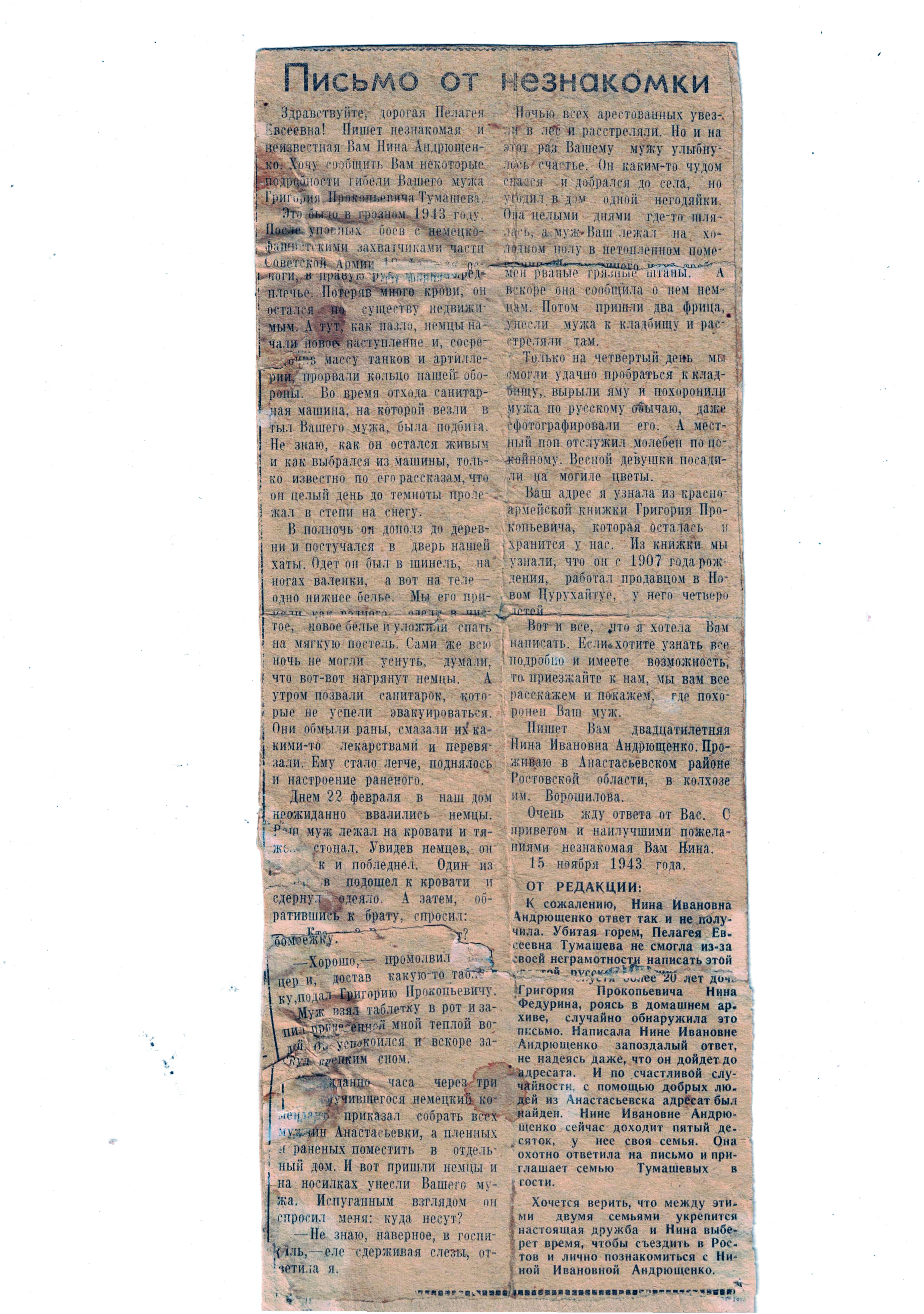 Письмо от незнакомки. Нина Ивановна Андрющенко о гибели Григория Прокопьевича Тумашева в 1943 году написала письмо его жене Пелагее Евсеевне Тумашевой.