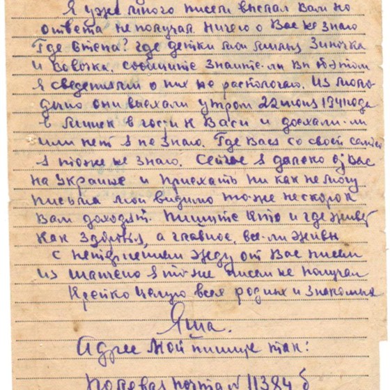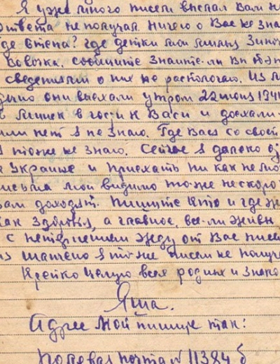 Яновский Анатолий Дмитриевич (1910 – 1941) – работник Центросоюза, занимался лесопоставками, невоеннообязанный. В июле 1941 года вступил в народное ополчение. Письма родным в г. Химки писал каждые 2–3 дня. Всего с фронта пришло 30 весточек – письма, открытки, записки. А.Д. Яновский умер в октябре 1941 года от ран, полученных в бою.