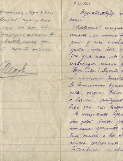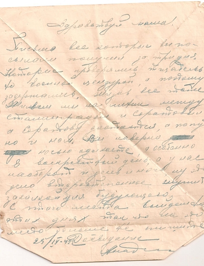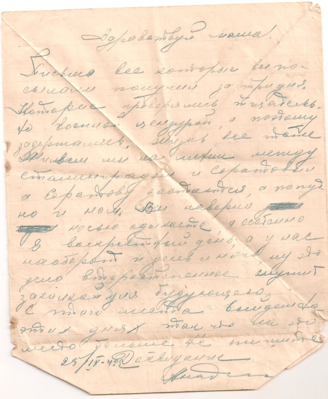 Из спроводительного документа: брат Михаил (1916 г.р.) в начале войны был на гастролях с оркестром Утесова в Москве и избежал блокадных мук. Вот ему-то и адресованы письма, мама писала ему почти ежедневно (июль 1941—июнь 1942). Сохранилось примерно 150 писем. Ветхий документ. Разрывы. Сгибы. Замятия. Пожелтения бумаги.