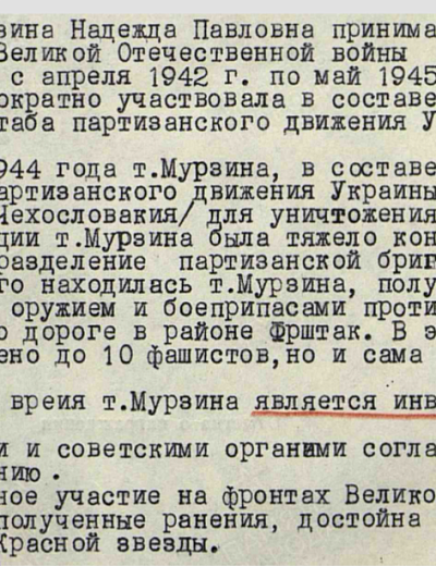 Мурзина (Ермакова) Надежда Павловна родилась 20 декабря 1924 г. в д. Садинка Смоленского района Смоленской области. В марте 1942 года, будучи 17-летней девушкой, пошла на войну добровольцем. В 1944-м была направлена в спецшколу при НКГБ в Киев, где проходила подготовку для выполнения боевого задания в тылу германско-фашистской армии. После обучения в разведшколе в октябре 1944 года в составе группы разведчиков была высажена десантом на парашюте в глубокий тыл врага. Она приземлилась в горах Моравии и повисла на высокой сосне, зацепившись стропами парашюта за ветки. Ей пришлось обрезать стропы и падать с большой высоты. На пятые сутки, в крайне тяжёлом состоянии её обнаружили в лесу партизаны из бригады имени Яна Жижки и доставили в расположение одного из отрядов бригады, в составе которой она воевала до соединения с частями Советской Армии. Надежда Ермакова, обладая хорошим знанием чешского и словацкого языков, часто направлялась в населённые пункты, в крупные промышленные города, где стояли гарнизоны фашистской армии в разведку, на связь с подпольными организациями, вместе с другими разведчиками добывала секретные данные о дислокации, численности вражеских гарнизонов и оружия. Тяжело раненному командиру бригады, майору Советской Армии Даян Баяновичу Мурзину она спасла жизнь. За смелость и личную храбрость пользовалась большим уважением среди партизан и подпольщиков. Надежда Павловна награждена орденом «Красная звезда», медалью «Партизан Отечественной войны», медалями СССР, орденами и медалями ЧССР.