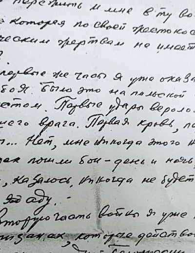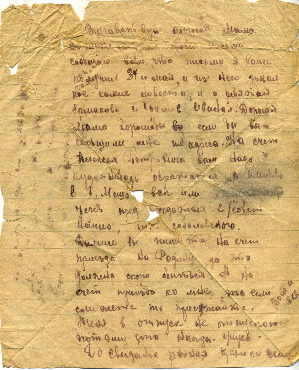 В.А. Терехов родился в д. Соболевка Сухиничского района в 1923 году. 15 января 1943 года был призван на фронт. В феврале 1944 года пропал без вести. В Соболевке осталась мать Терехова Надежда Филипповна. Больше информации об авторе письма нет.