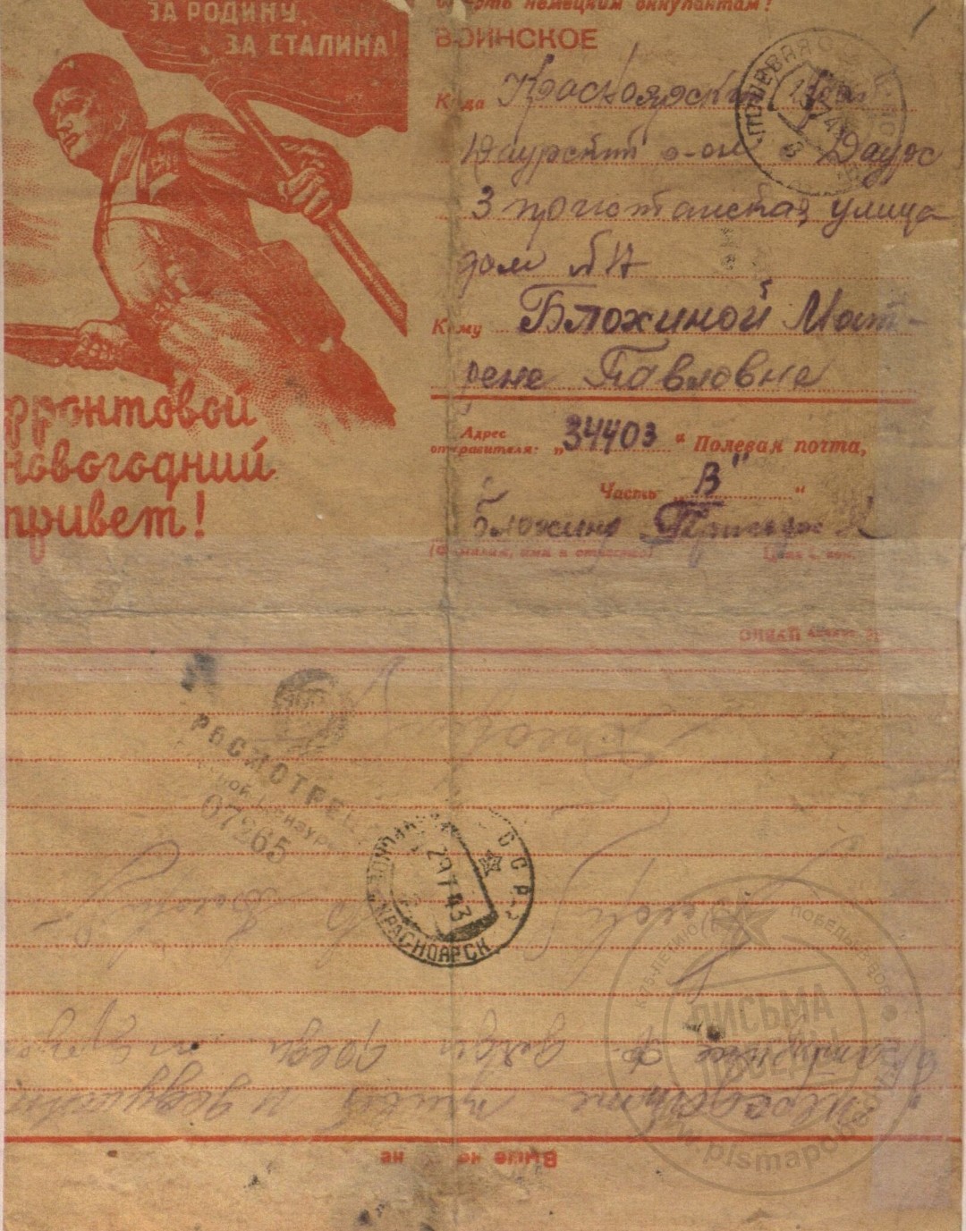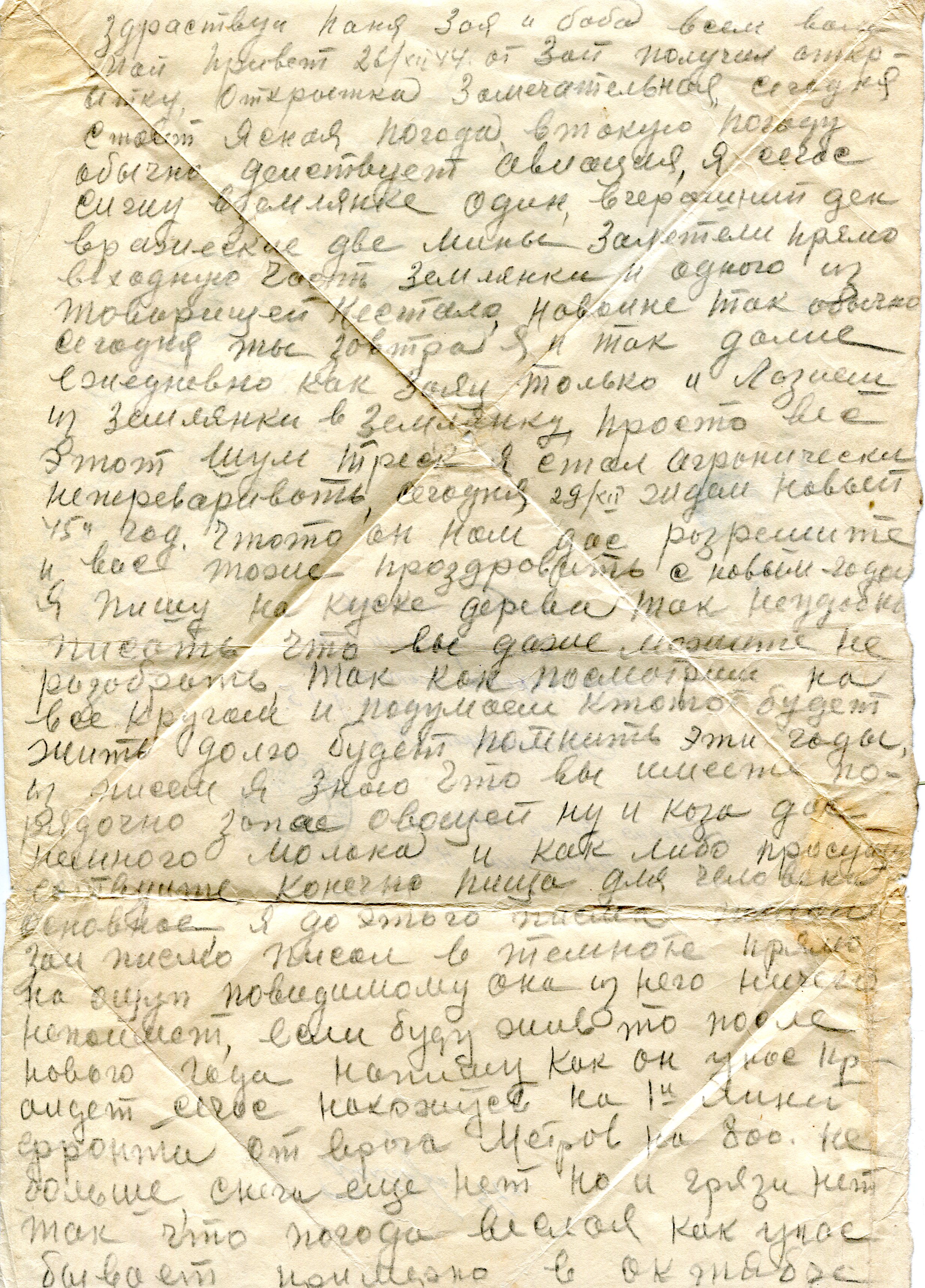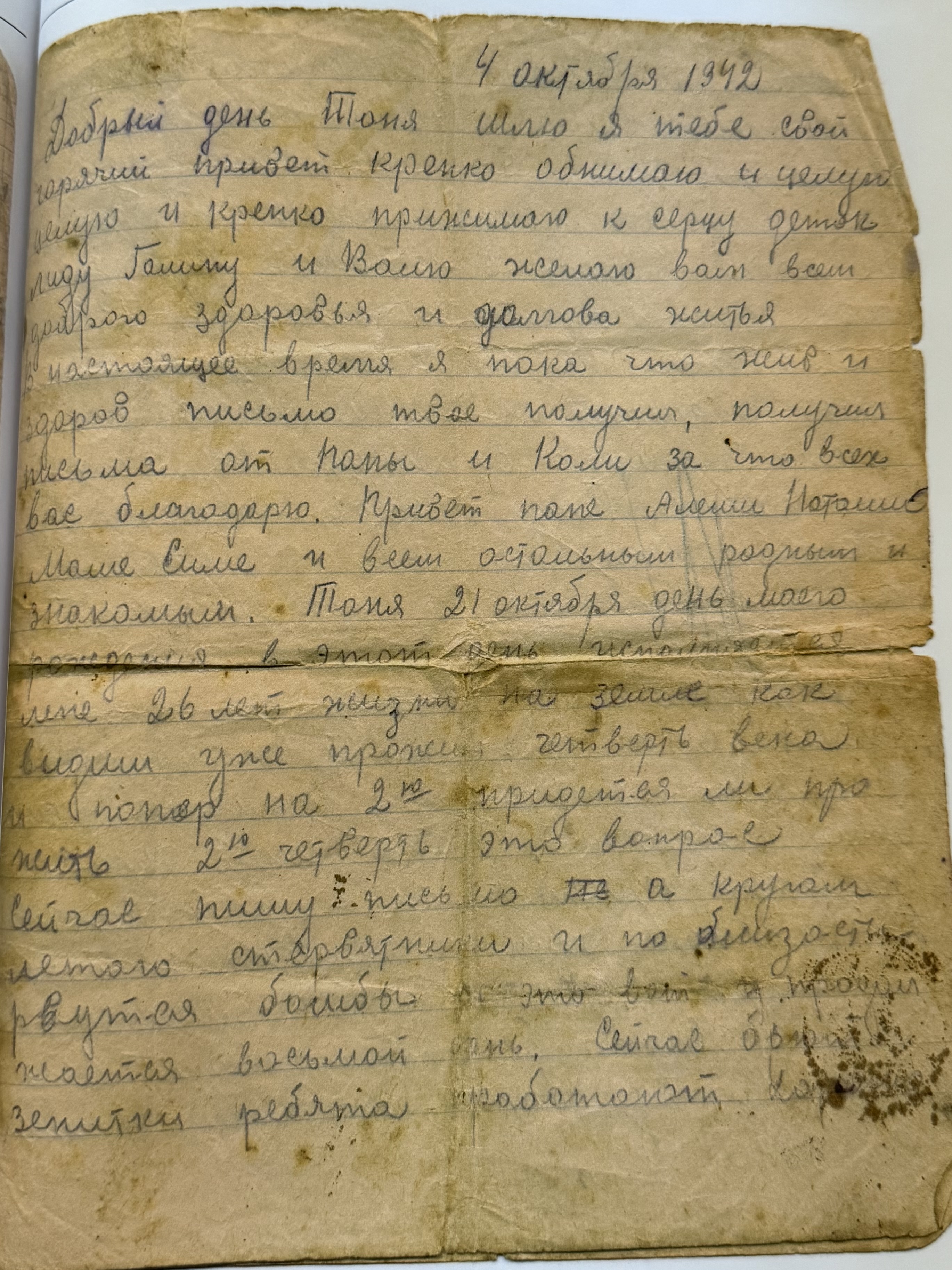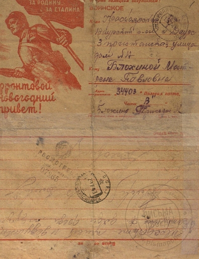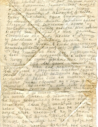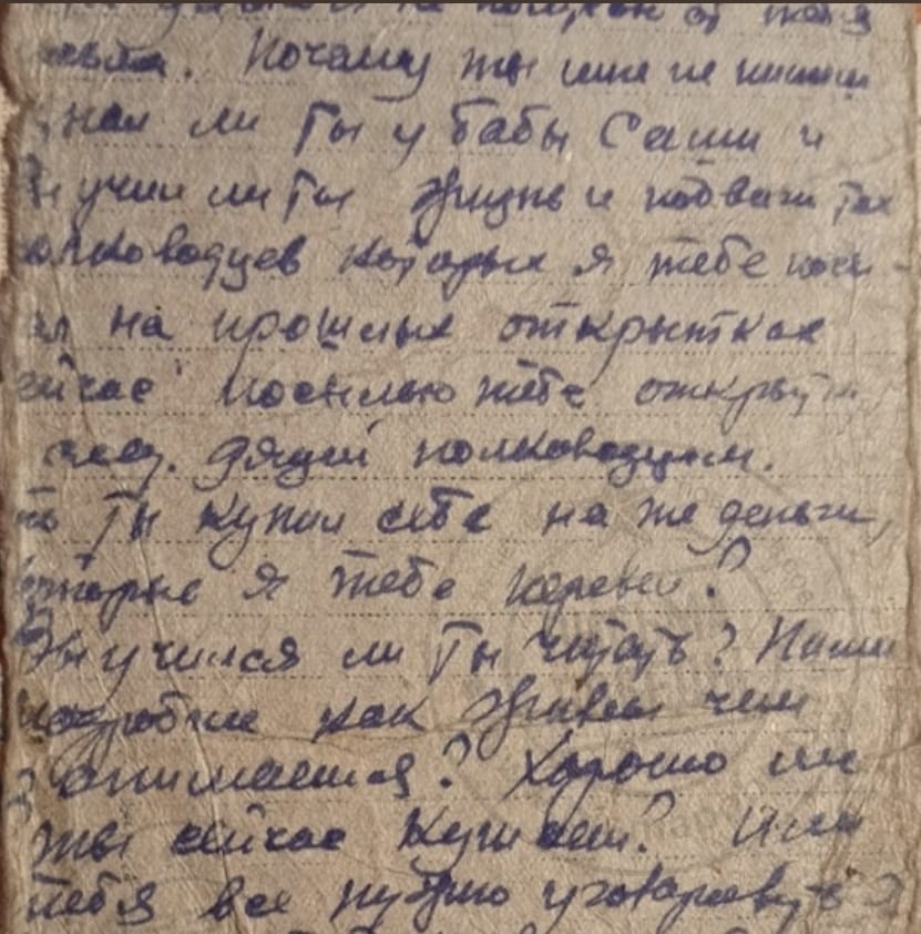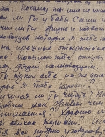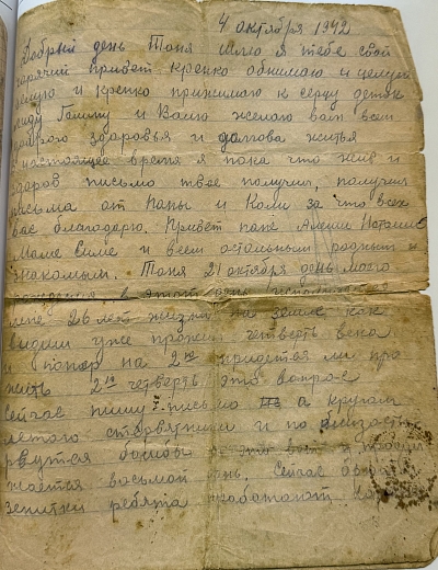 Из спроводительного документа: Михаил (1916 г.р.) в начале войны был на гастролях с оркестром Утесова в Москве и избежал блокадных мук. Вот ему-то и адресованы письма, мама писала ему почти ежедневно (июль 1941—июнь 1942). Сохранилось примерно 150 писем. Ветхий документ. Разрывы. Сгибы. Замятия. Пожелтения бумаги.