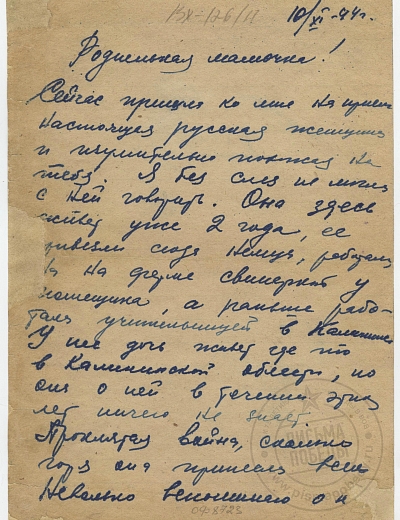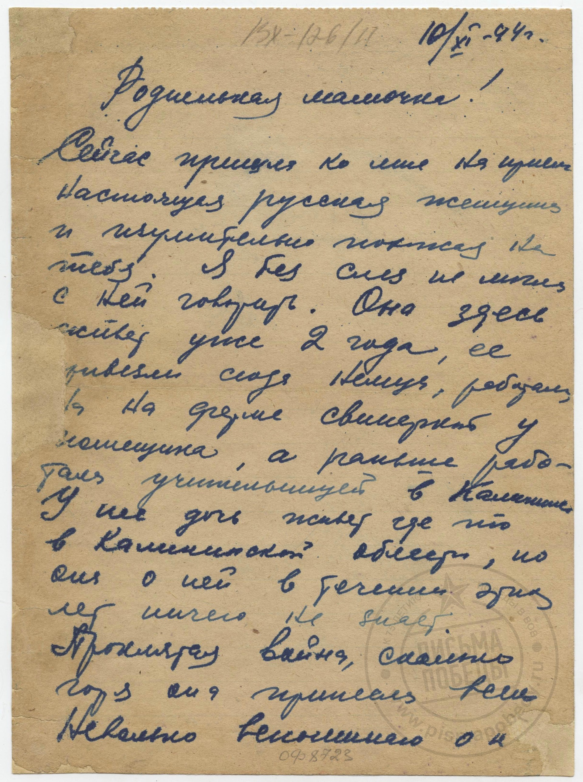 10 декабря 1941 года. И вот следующее письмо: «В настоящее время нахожусь в пути на фронт в Волоколамском направлении. До фронта осталось километров восемьдесят. Доехали до Нахабино поездом и идем пешком, прошли город Истра, от которого остались одни трубы, и также от деревень, через которые мы идем. Ну, дойдем до фронта, мы ему покажем!» И затем было последнее письмо с передовой в тридцати километрах от Волоколамска.