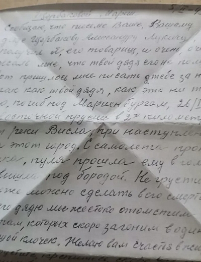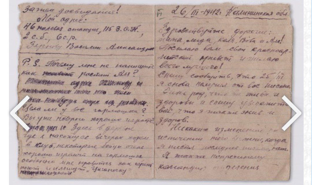 Красноармеец Иван Саверьянович Заболотный, последнее письмо домой жене Марии и сыновьям Адольфу, и Александру. Погиб 18 мая 1942 года.