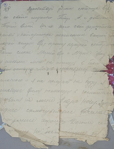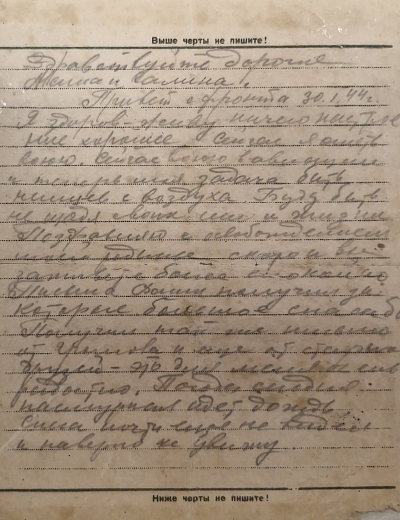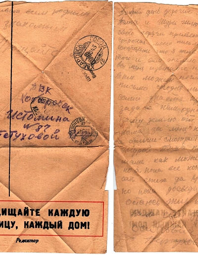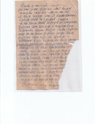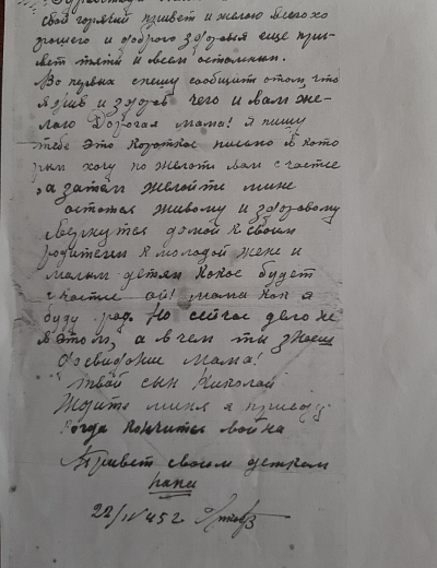 К братьям обращается: «Успеете и вы послужить Родине, не торопитесь Коля, вы с Петей туда, где я выйдем мы из строя, вы заступите. Увидеться нам видно не придётся. Охота мне, чтобы фамилия наша жила , не пропала. Далее пишет я со взводом за 30 минут уничтожил 100 немцев., но и жизнь висела на волоске.»…