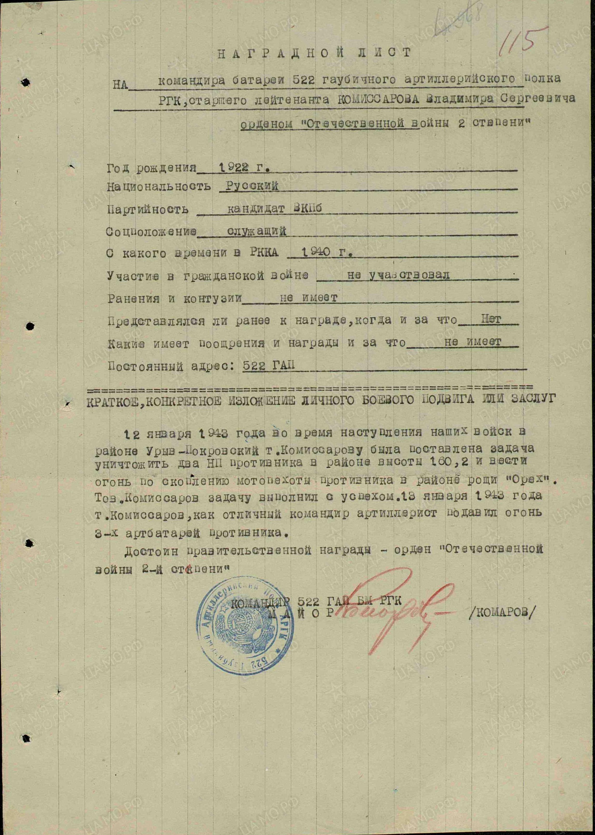 Владимир Сергеевич Комиссаров - выпускник 1-й Московской специальной артиллерийской школы 1940 года. Прошёл всю войну на должностях командира огневого взвода, командира батареи артиллерийского полка. Участвовал в Курской битве, в освобождении Украины, Румынии, Австрии.