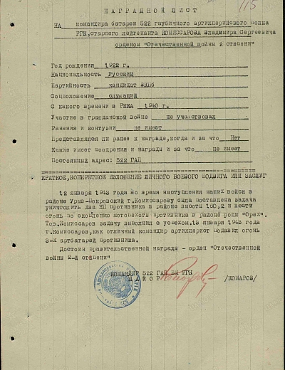 Награжден телефонист 4-ой батареи красноармеец Емельянов Павел Федорович за то, что он под артиллерийско-минометным огнем противника 12 февраля 1944 года в районе г. Витебск связал 11 порывов связи, тем самым способствовал выполнению боевой задачи.