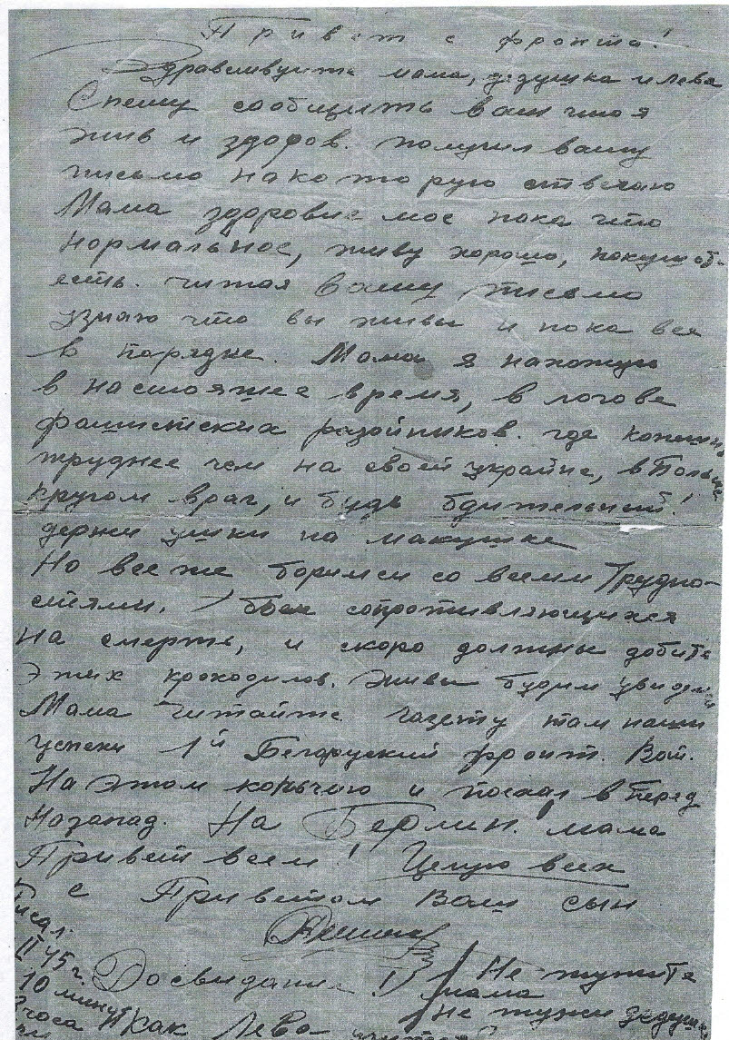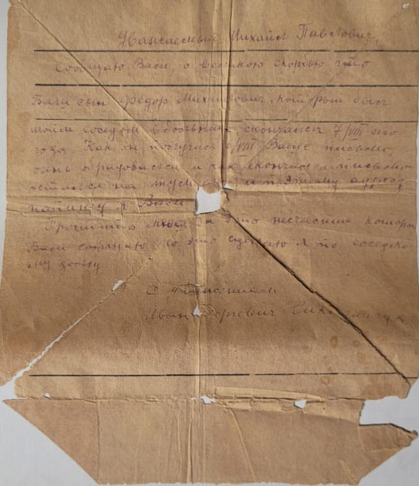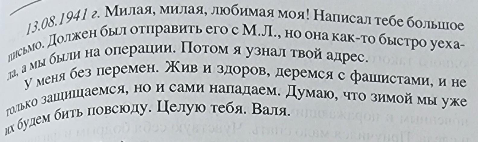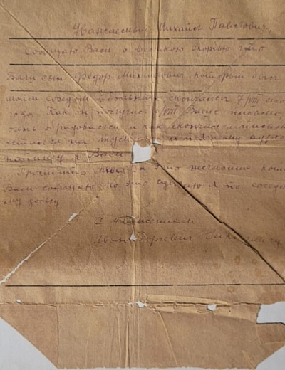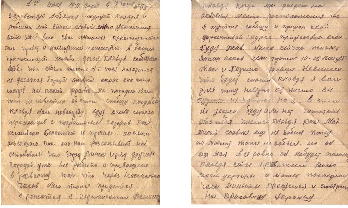 Есть сведения о дочери автора письма, кому оно и адресовано. Пивоварова Лидия Семеновна - выпускница средней школы №2 (ныне лицей №5) 1941 года, участница битвы за Москву. С первых дней войны Лидия Пивоварова поступила на курсы медсестер (курсы «Красного креста») и на практику в госпиталь. Раненые называли ее «Беленькая» (потом писали ей письма). В городе был организован военный отдел, где Лидия Семеновна стала инструктором по военно-физкультурной работе. В апреле 1942 г. вместе со своими подругами и Лидия Пивоварова (первая, за ней еще 40 девушек) подали заявление об отправке на фронт. Они + были призваны в Особую Московскую Армию ПВО Западного фронта, которым командовал Г.К.Жуков. Их направили в 51-ю Зенитно-Артиллерийскую Дивизию, 176-й полк. Сначала Лидия Семеновна была связистом-линейщиком, потом старшим прожектористом Получила звание «ефрейтор». Затем была переведена на новейшую станцию орудийной наводки (СОН – 2) наводчиком. Лидия Семеновна была бойцом-отличником, получила благодарность от И.Сталина. Была в числе тех, кто давал грандиозный салют Победы. За годы Вов была награждена орденом Отечественной войны II степени, медалями «За боевые заслуги», «За оборону Москвы», «За победу над фашистской Германией», медалью Жукова и др.