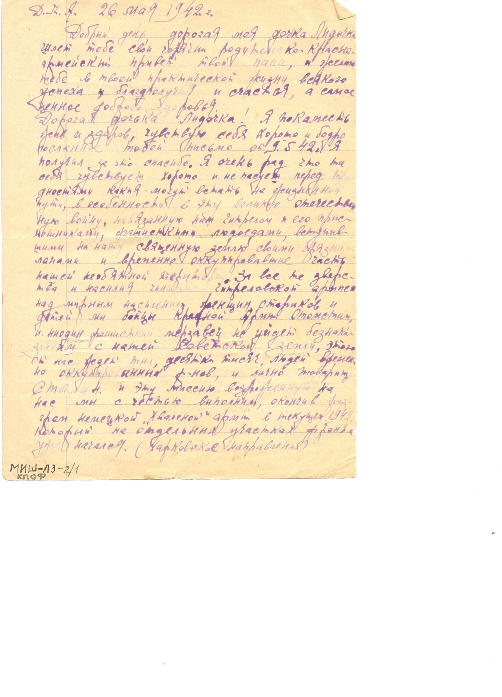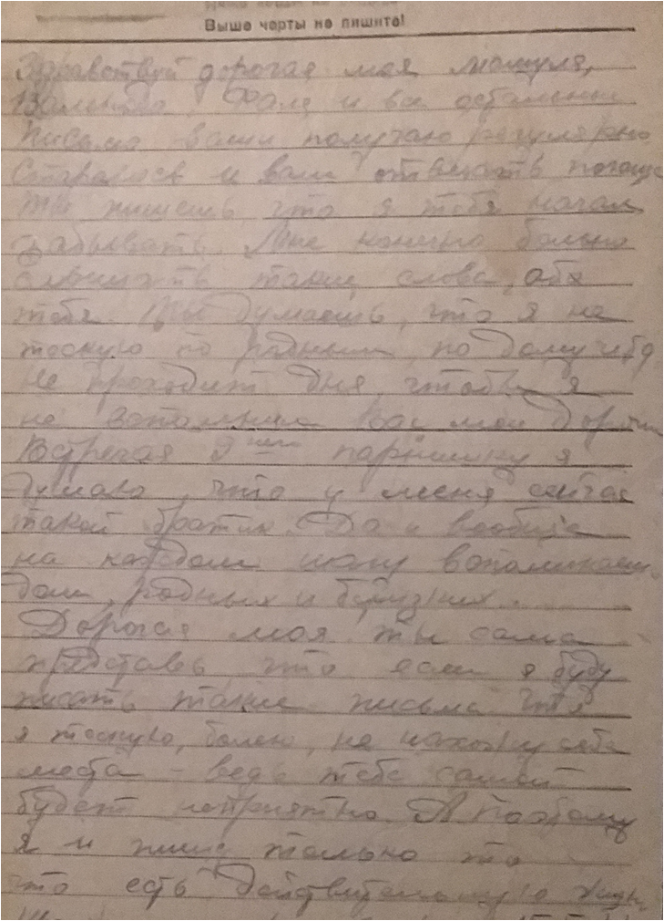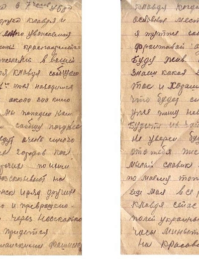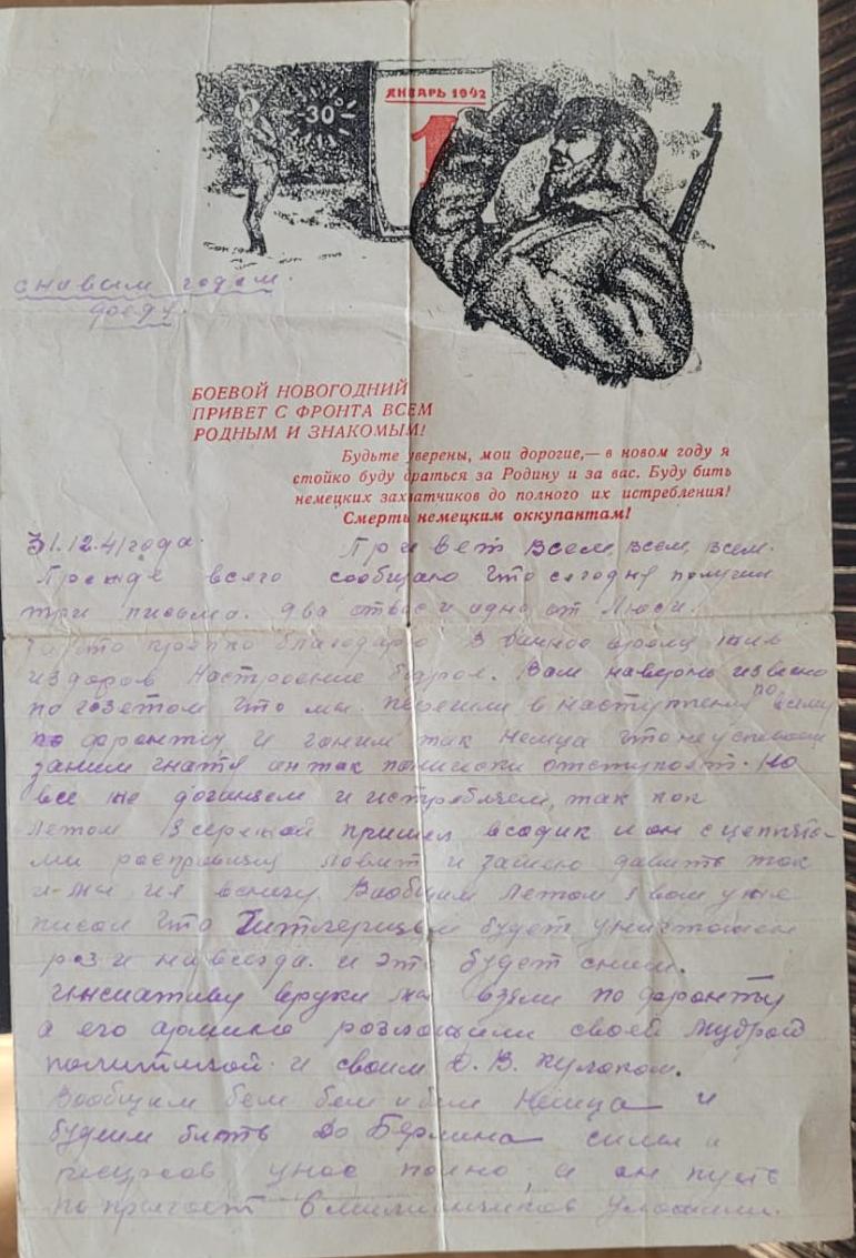 Есть сведения о дочери автора письма, кому оно и адресовано. Пивоварова Лидия Семеновна - выпускница средней школы №2 (ныне лицей №5) 1941 года, участница битвы за Москву. С первых дней войны Лидия Пивоварова поступила на курсы медсестер (курсы «Красного креста») и на практику в госпиталь. Раненые называли ее «Беленькая» (потом писали ей письма). В городе был организован военный отдел, где Лидия Семеновна стала инструктором по военно-физкультурной работе. В апреле 1942 г. вместе со своими подругами и Лидия Пивоварова (первая, за ней еще 40 девушек) подали заявление об отправке на фронт. Они + были призваны в Особую Московскую Армию ПВО Западного фронта, которым командовал Г.К.Жуков. Их направили в 51-ю Зенитно-Артиллерийскую Дивизию, 176-й полк. Сначала Лидия Семеновна была связистом-линейщиком, потом старшим прожектористом Получила звание «ефрейтор». Затем была переведена на новейшую станцию орудийной наводки (СОН – 2) наводчиком. Лидия Семеновна была бойцом-отличником, получила благодарность от И.Сталина. Была в числе тех, кто давал грандиозный салют Победы. За годы Вов была награждена орденом Отечественной войны II степени, медалями «За боевые заслуги», «За оборону Москвы», «За победу над фашистской Германией», медалью Жукова и др.