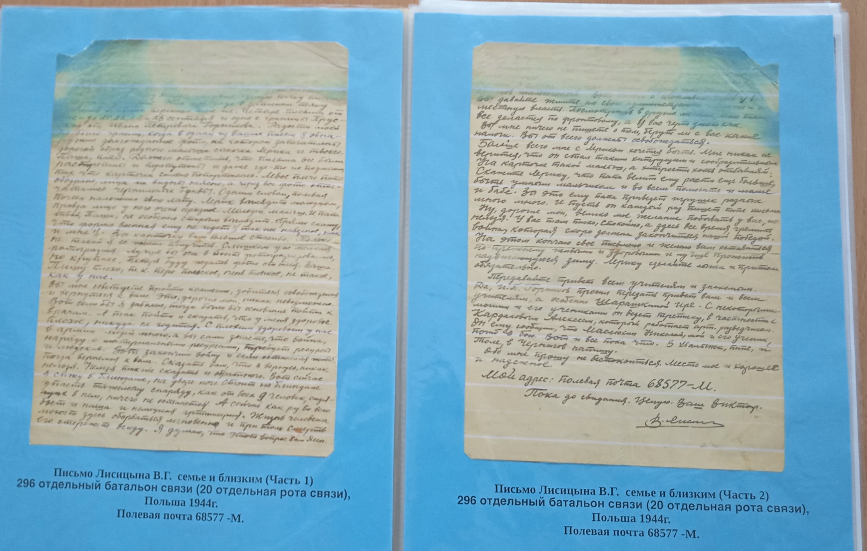 нашей победой на этом кончаю свое письмецо и желаю вам оставаться по-прежнему живыми и здоровыми . Передавать привет всем учителям и знакомым. Да, Горников просил передать привет вам и всем учителям, особенно Шараткиной Ире. С некоторыми учениками он ведёт переписку, в частности с Кардаковым Алексеем, который работает арт. разведчиком. Он ему сообщил что Маслюхин Николай, мой и его ученик, погиб в бою вот и всё пока что. Обо мне прошу не беспокоиться место моё хорошее и надёжное. Пока до свидания. Целую .ваш Виктор.