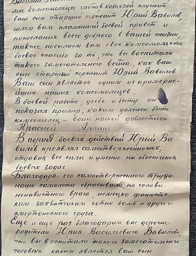 Ю.В. Вавилов родился 20.02.1924 Место рождения Кировская обл., Халтуринский р-н, г. Халтурин. Призван на фронт 20 ноября 1941 г. Авиатехник 2 эскадрильи 569-го ШАП.