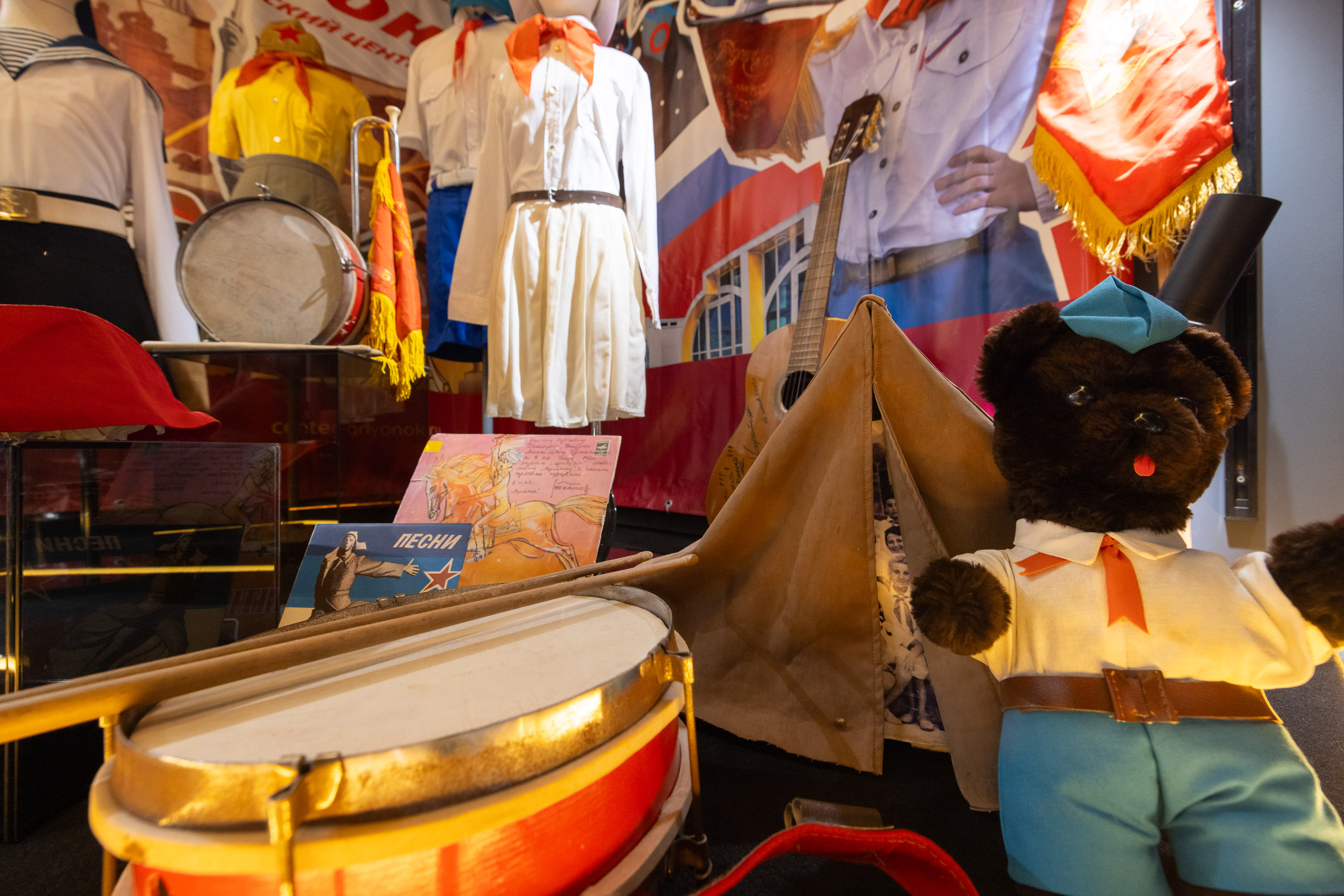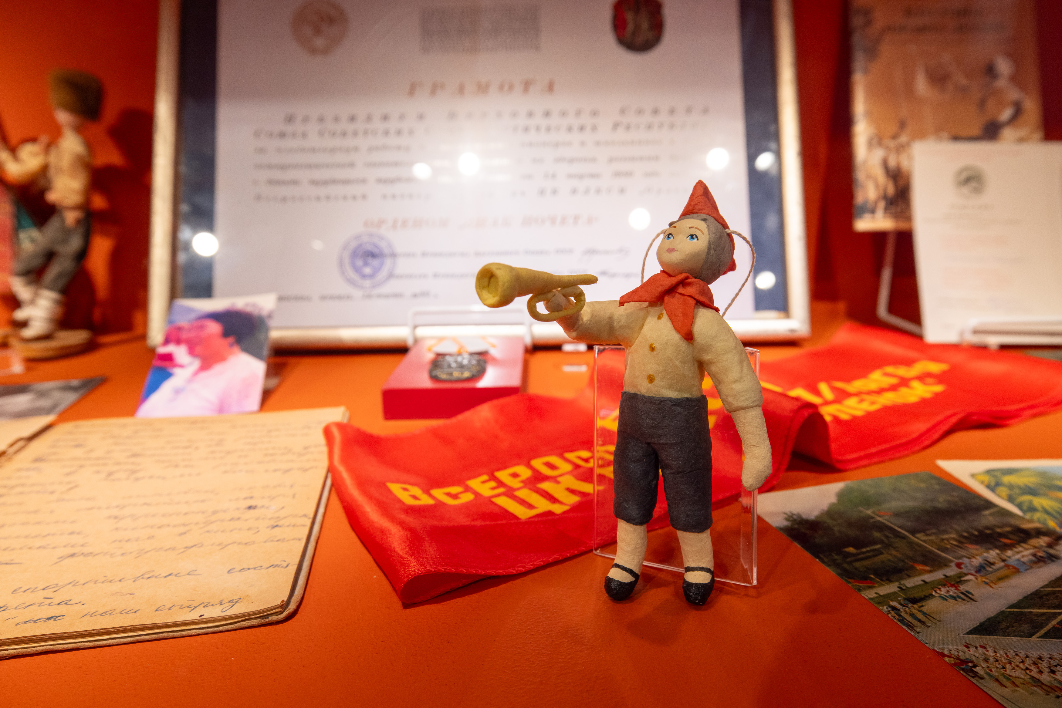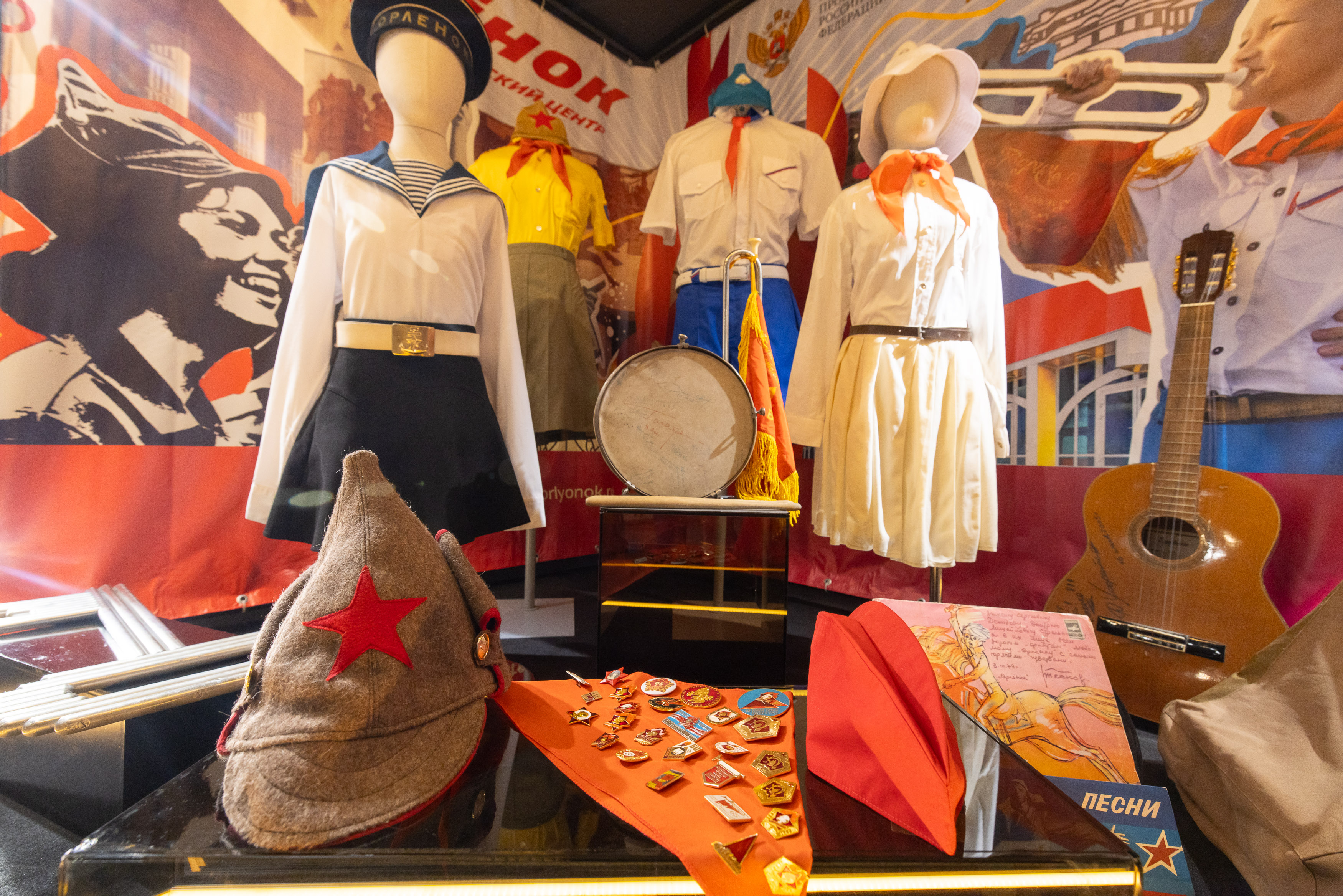 Некоторые экспонаты можно потрогать руками: в коллекции значков детских общественных организаций России и других стран найти значки своего города или региона, на барабане или на коленках сыграть старые пионерские марши, а на старом проигрывателе послушать первые орлятские песни, записанные на виниловые пластинки. Можно сделать селфи на фоне гипсового горниста, фигуры которых когда-то украшали школьные и лагерные дворы и линейки.