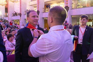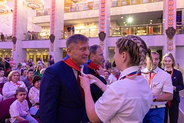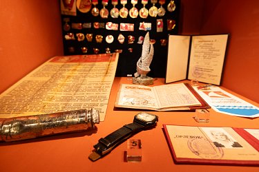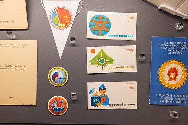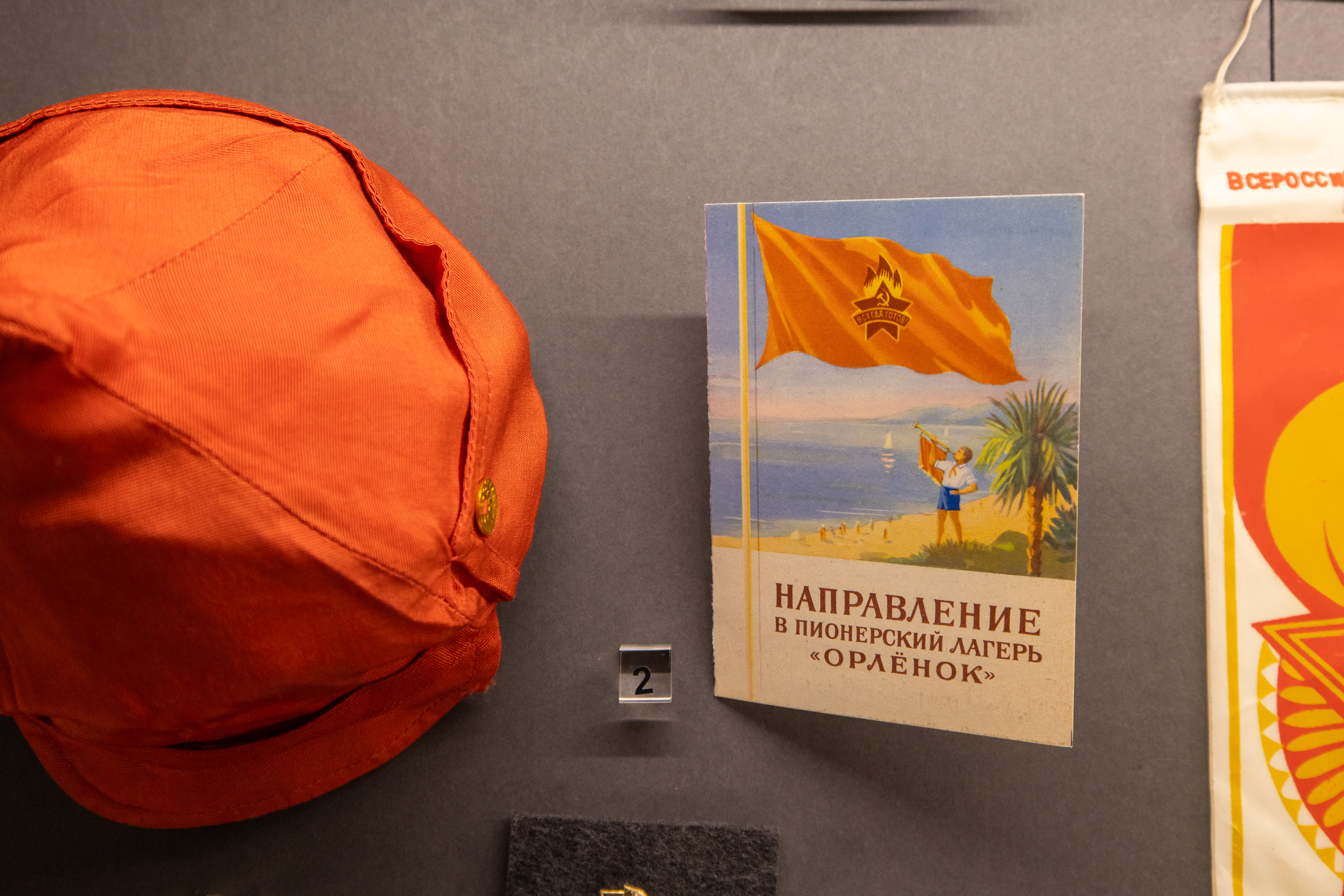 4. В экспозиции представлено Первое красное бархатное знамя Всероссийского пионерского лагеря «Орлёнок», на котором вышит пионерский значок. Самые активные пионеры получали почётное право фотографироваться у этого развёрнутого знамени лагеря. Среди них – будущий чемпион мира по шахматам Анатолий Карпов