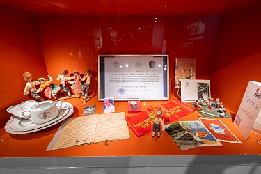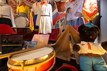 3. Среди экспонатов выставки – арт-объекты, символизирующие звонкое пионерское детство, когда под звуки горнов и барабанов «на борьбу, на труд, на праздник пионеры гордо шли». Это и алый пионерский галстук, развевающие концы которого говорили, что его обладатели будут бороться с любой несправедливостью за Родину, Добро и Справедливость. Атрибутом того времени были горн и барабан, задающие бодрый ритм пионерской жизни.
